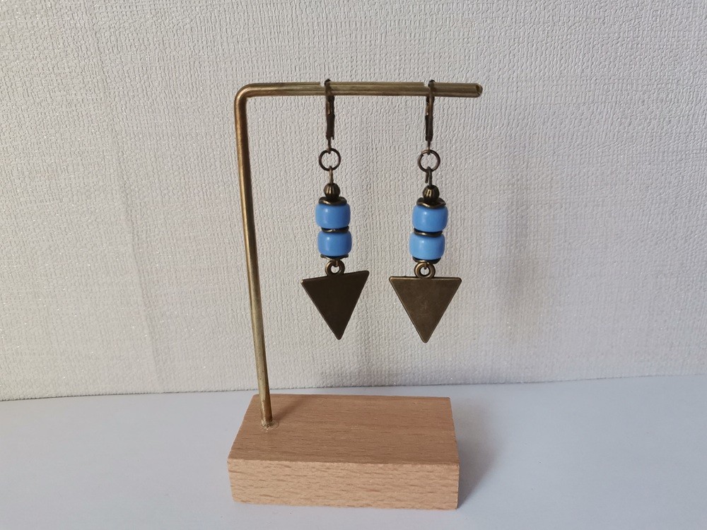 Boucles d'oreilles pendantes avec pendentif triangle en métal, perles en verre colonne et apprêts de couleur bronze