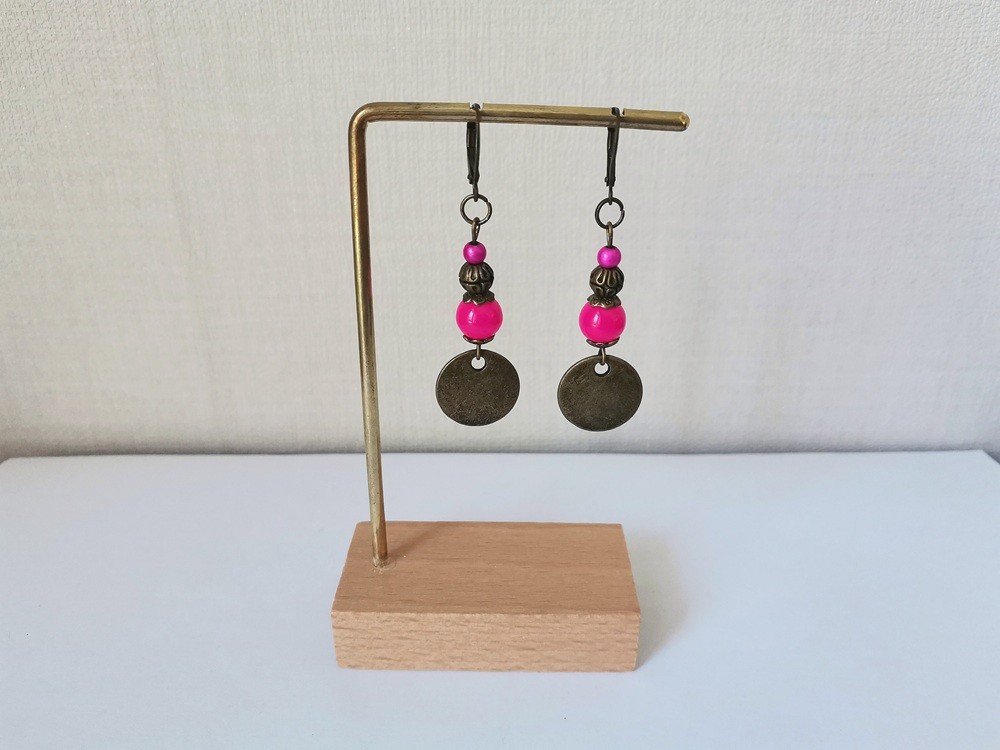 Boucles d'oreilles pendentif bronze et perles en verre imitation jade fuchsia
