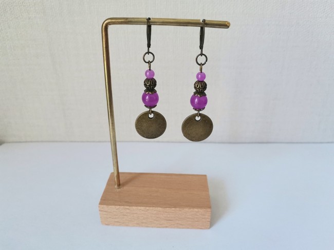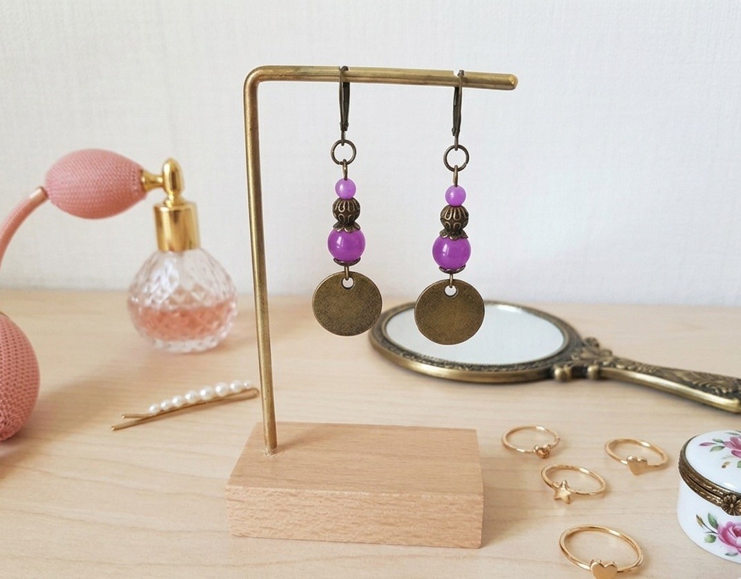 Boucles d'oreilles pendentif bronze et perles en verre imitation jade violette