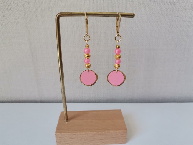 Boucles d'oreilles en acier inoxydable (dormeuse à levier, tige et anneaux) avec petites perles en verre de 4 mm, pendentif métal doré et sequin fer rose