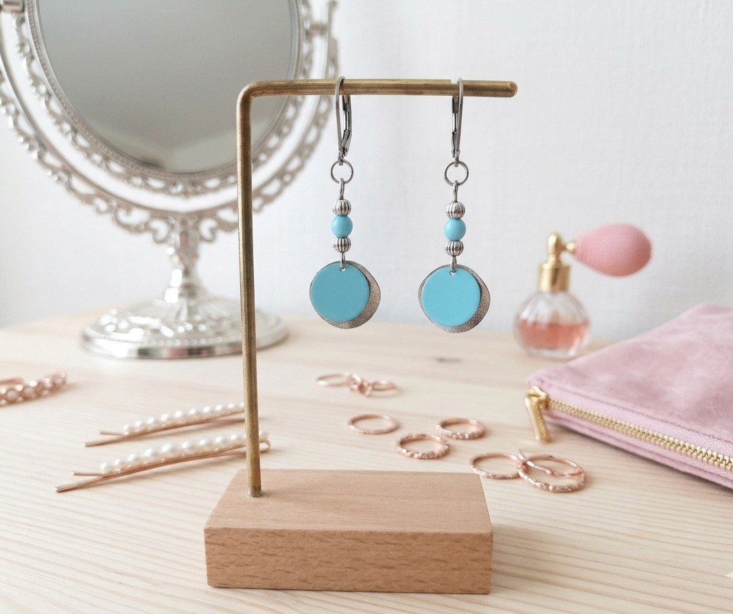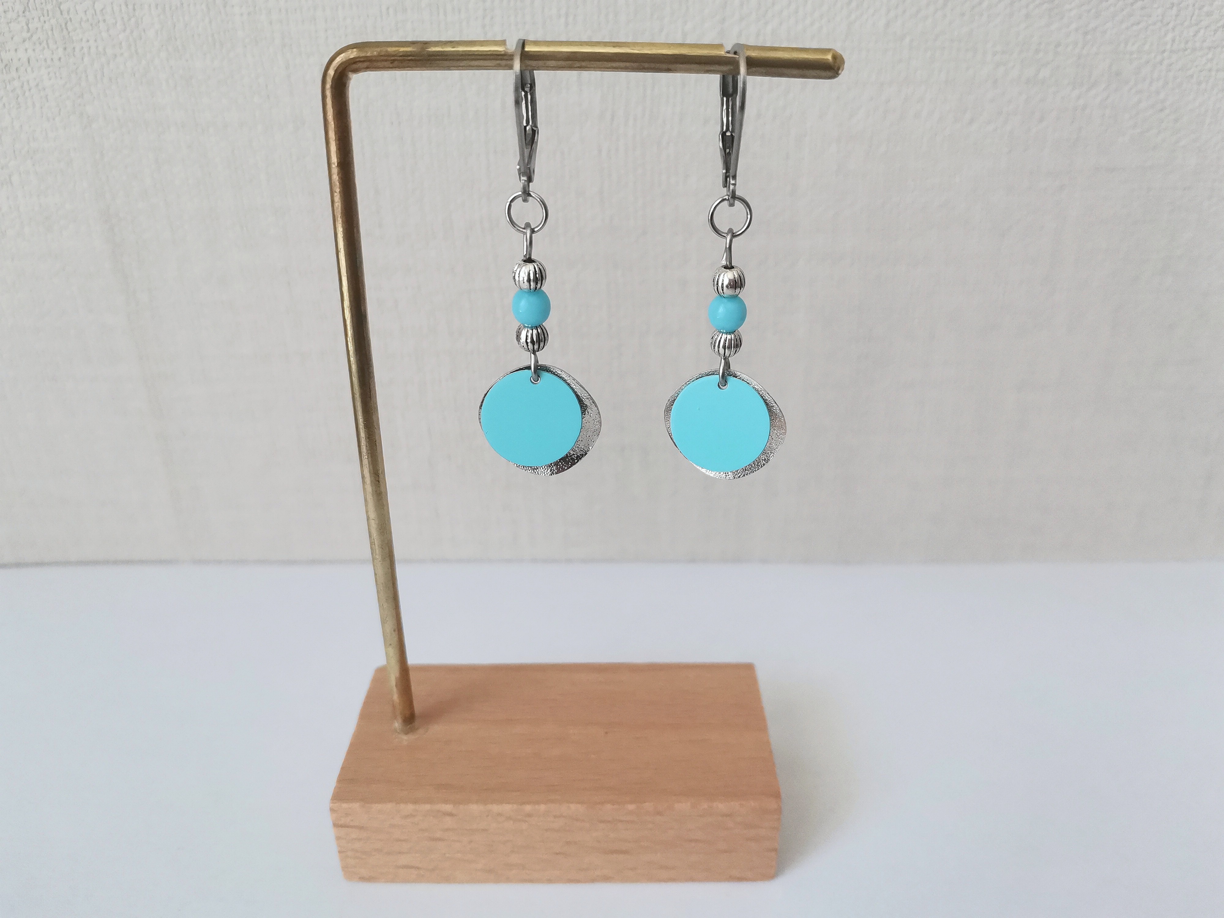 Boucles d'oreilles en acier inoxydable (dormeuse à levier, tige et anneaux) avec petites perles en verre de 4 mm, pendentif métal argent mat et sequin fer bleu