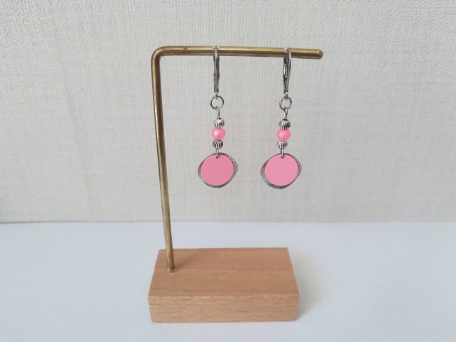 Boucles d'oreilles en acier inoxydable (dormeuse à levier, tige et anneaux) avec petites perles en verre de 4 mm, pendentif métal argent mat et sequin fer rose
