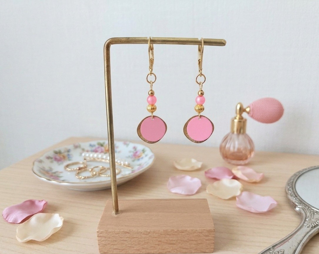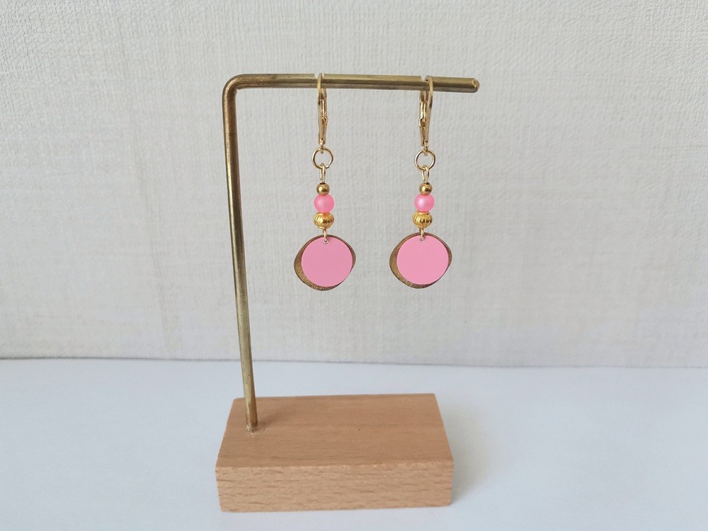 Boucles d'oreilles en acier inoxydable de couleur doré (dormeuse à levier, tige et anneaux) avec petites perles en verre de 4 mm, pendentif métal doré et sequin fer rose