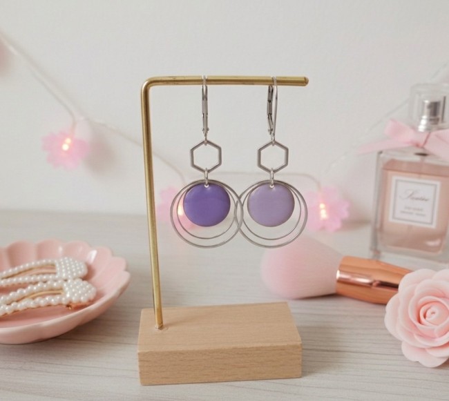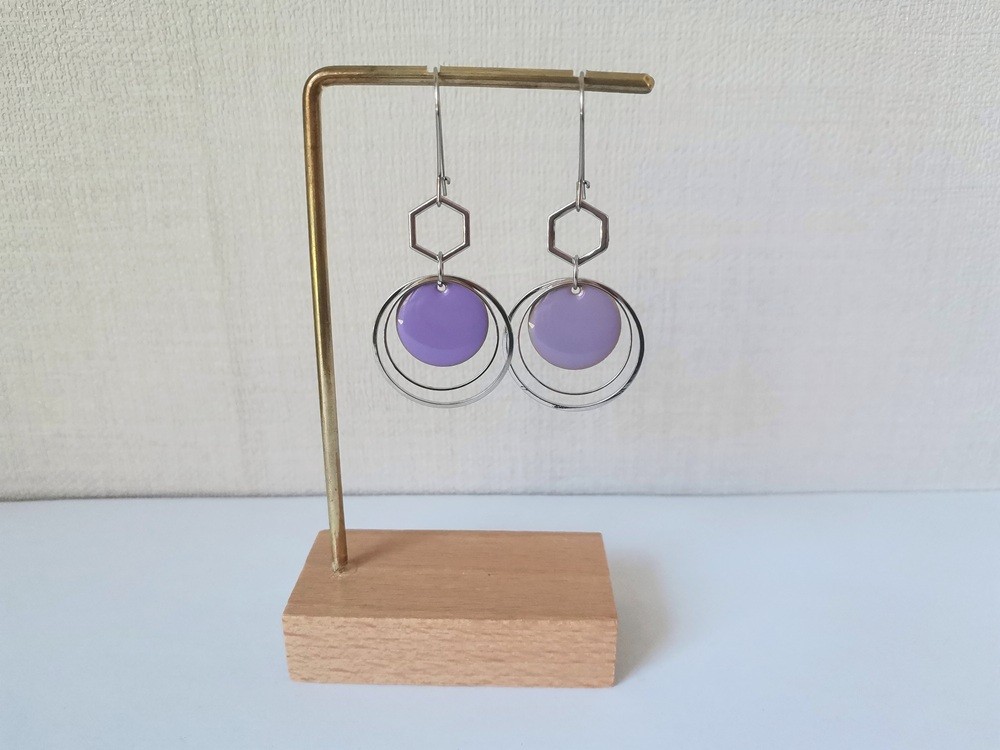 Boucles d'oreilles acier inoxydable anneaux et sequin émail violet clair