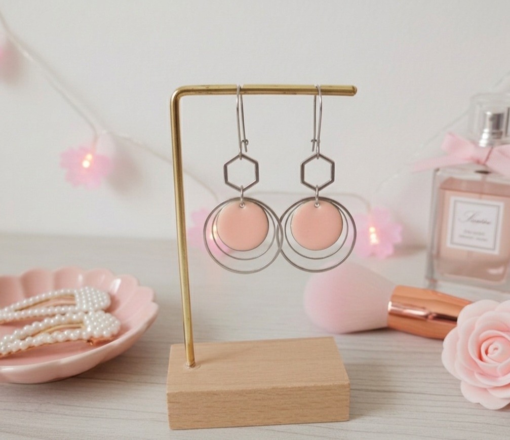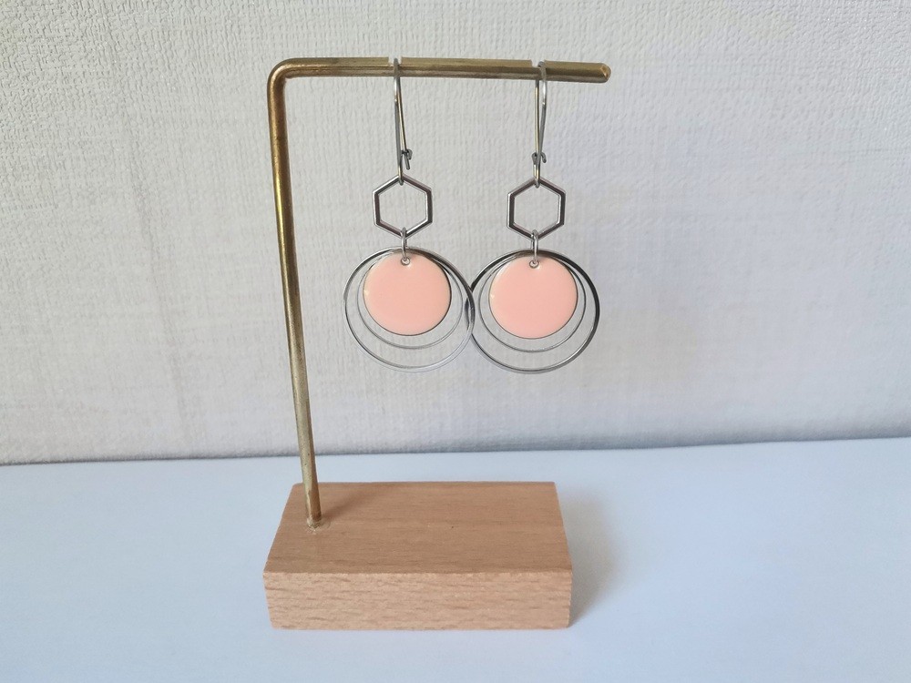 Boucles d'oreilles montées sur dormeuses à levier en acier inoxydable, pendentif émail rond 16 mm, connecteur métal octoganal sur anneaux fermés de 20 et 25 mm de diamètre