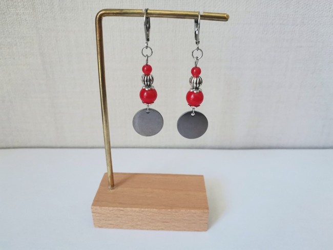Boucles d'oreilles composées d'un pendentif forme ronde en métal et de perles en verre imitation jade de 8 et 4 mm