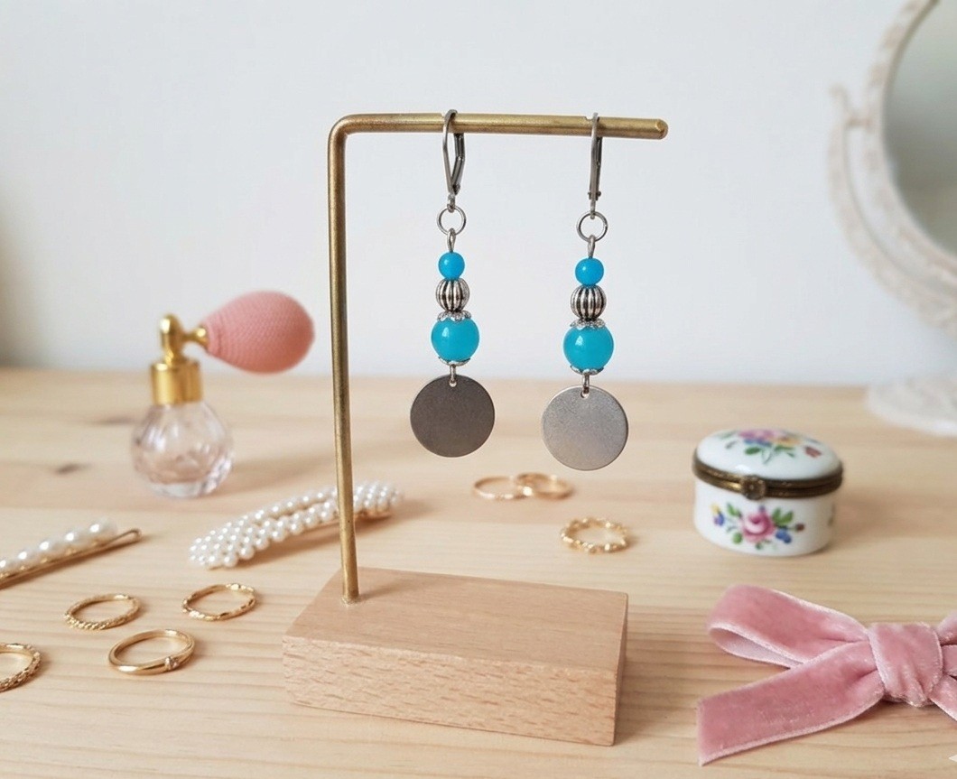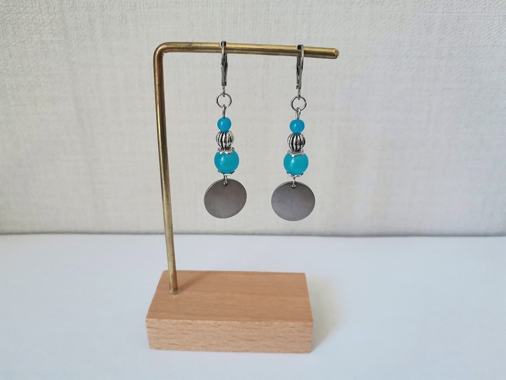 Boucles d'oreilles acier inoxydable, pendentif rond et perles imitation jade bleu