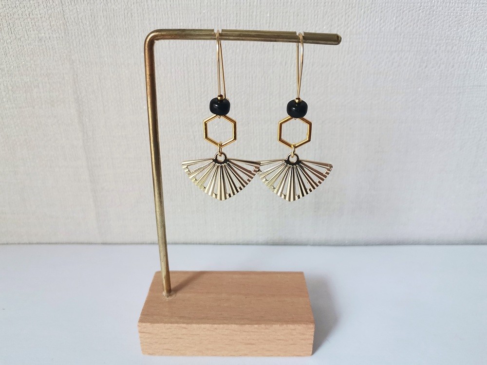 Boucles d'oreilles composées d'un pendentif forme éventail en métal doré, connecteur octogonal et de perles en verre 6 mm rondelle