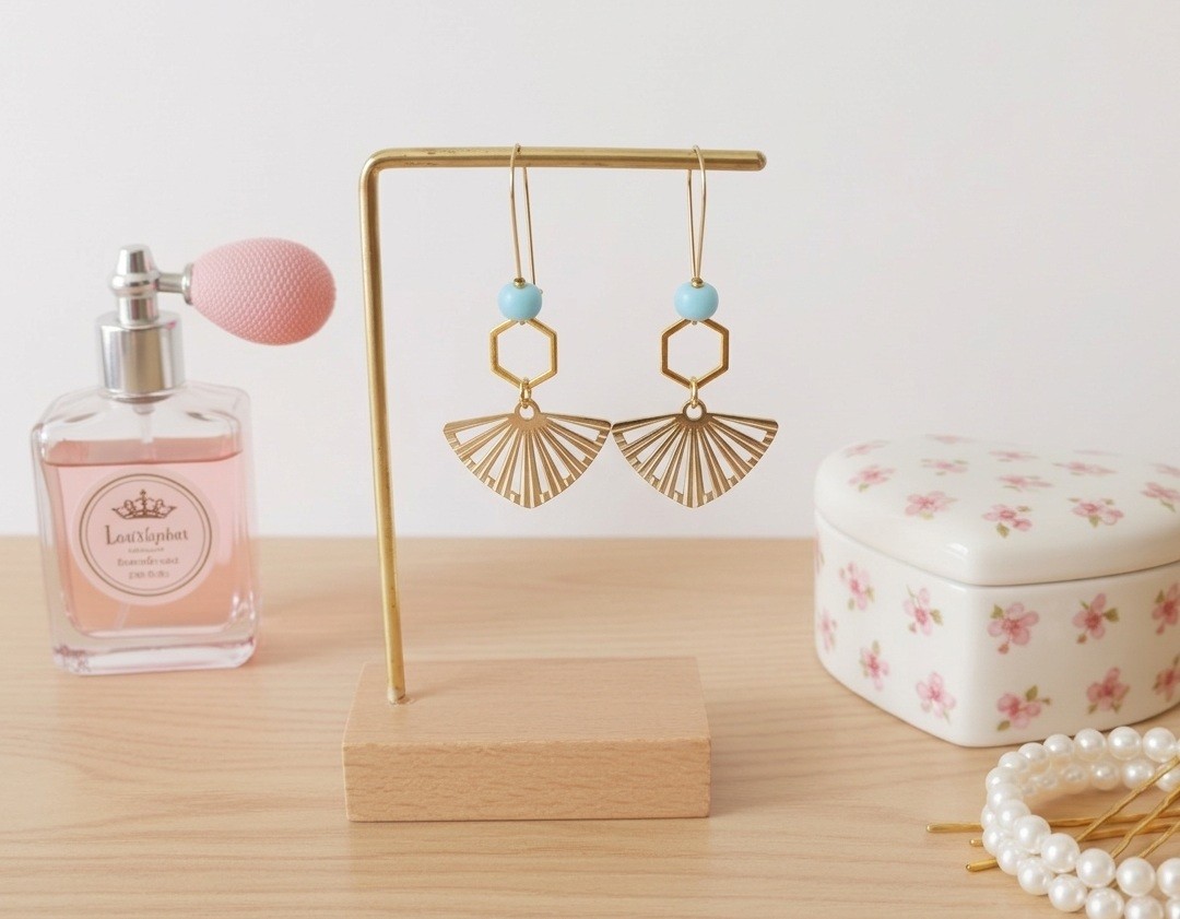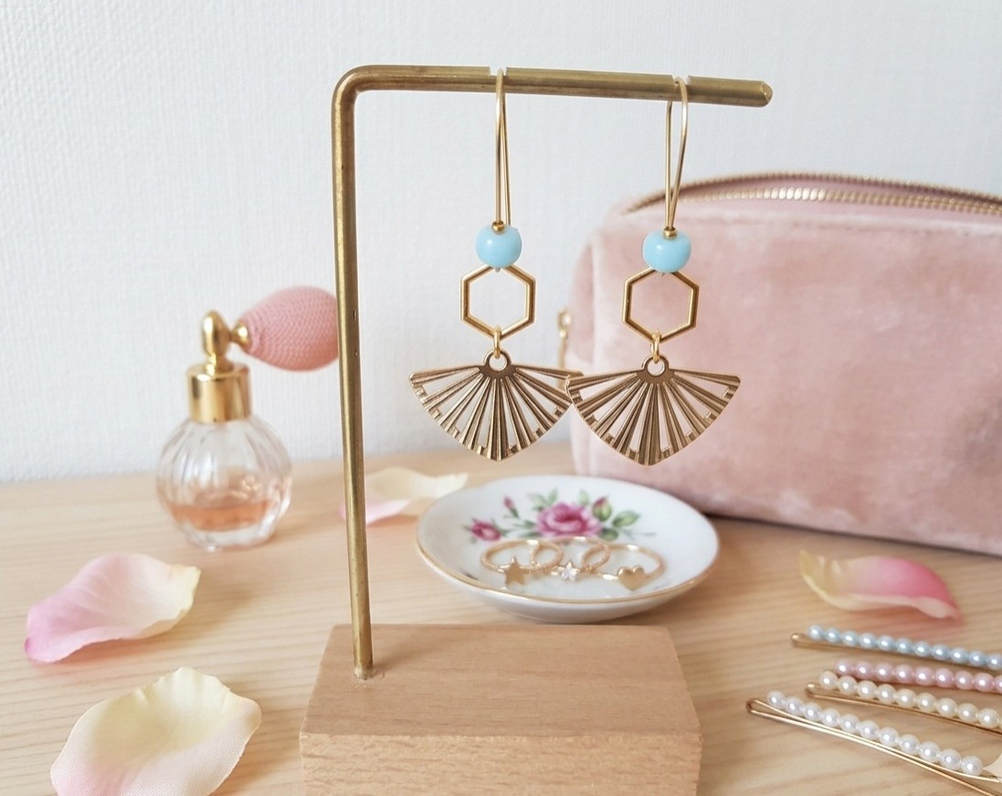 Boucles d'oreilles acier inoxydable doré pendentif éventail et perles bleu ciel