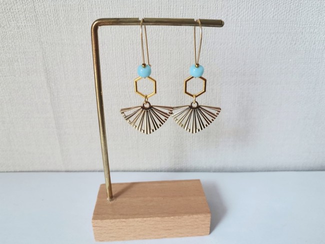 Boucles d'oreilles composées d'un pendentif forme éventail en métal doré, connecteur octogonal et de perles en verre 6 mm rondelle