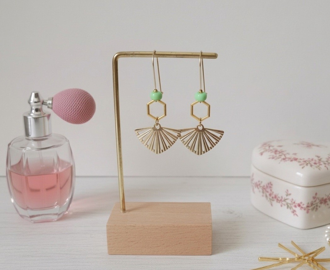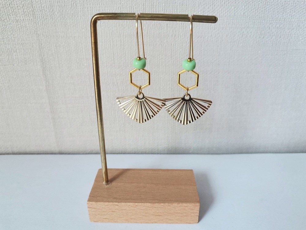 Boucles d'oreilles acier inoxydable doré pendentif éventail et perles vertes clair