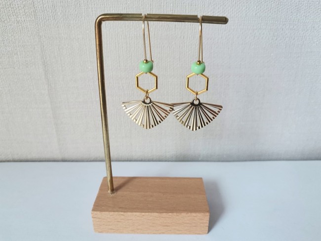 Boucles d'oreilles composées d'un pendentif forme éventail en métal doré, connecteur octogonal et de perles en verre 6 mm rondelle