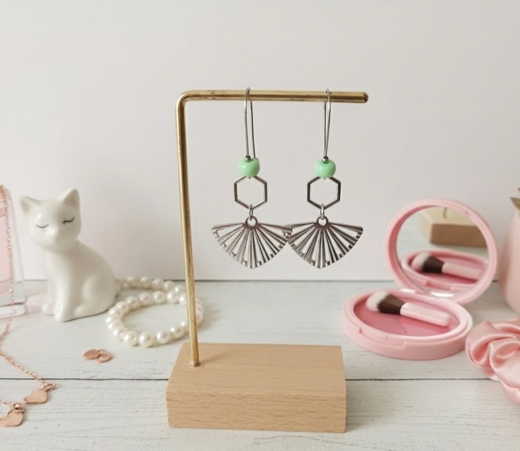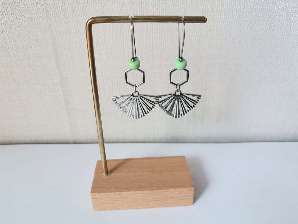 Boucles d'oreilles acier inoxydable pendentif éventail et perles vert clair