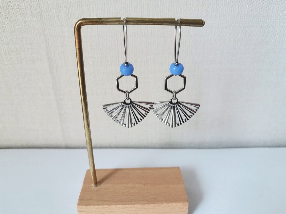 Boucles d'oreilles composées d'un pendentif forme éventail , connecteur octogonal et de perles en verre 6 mm rondelle