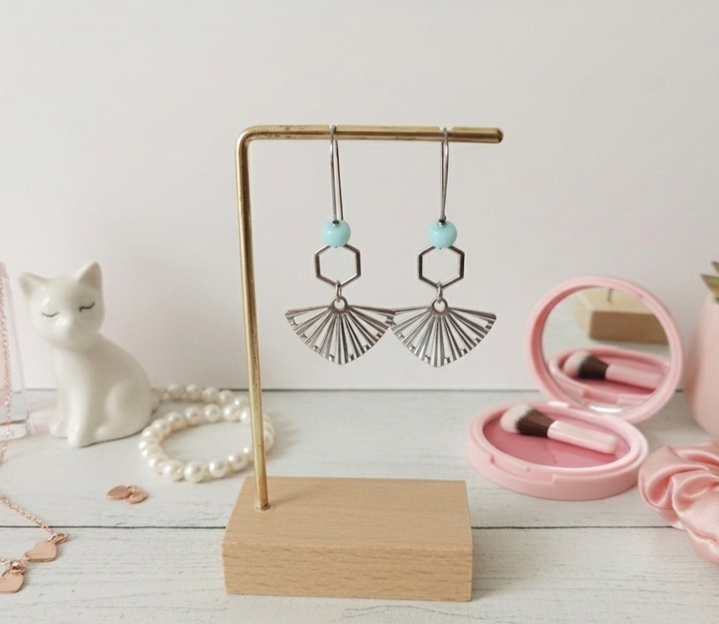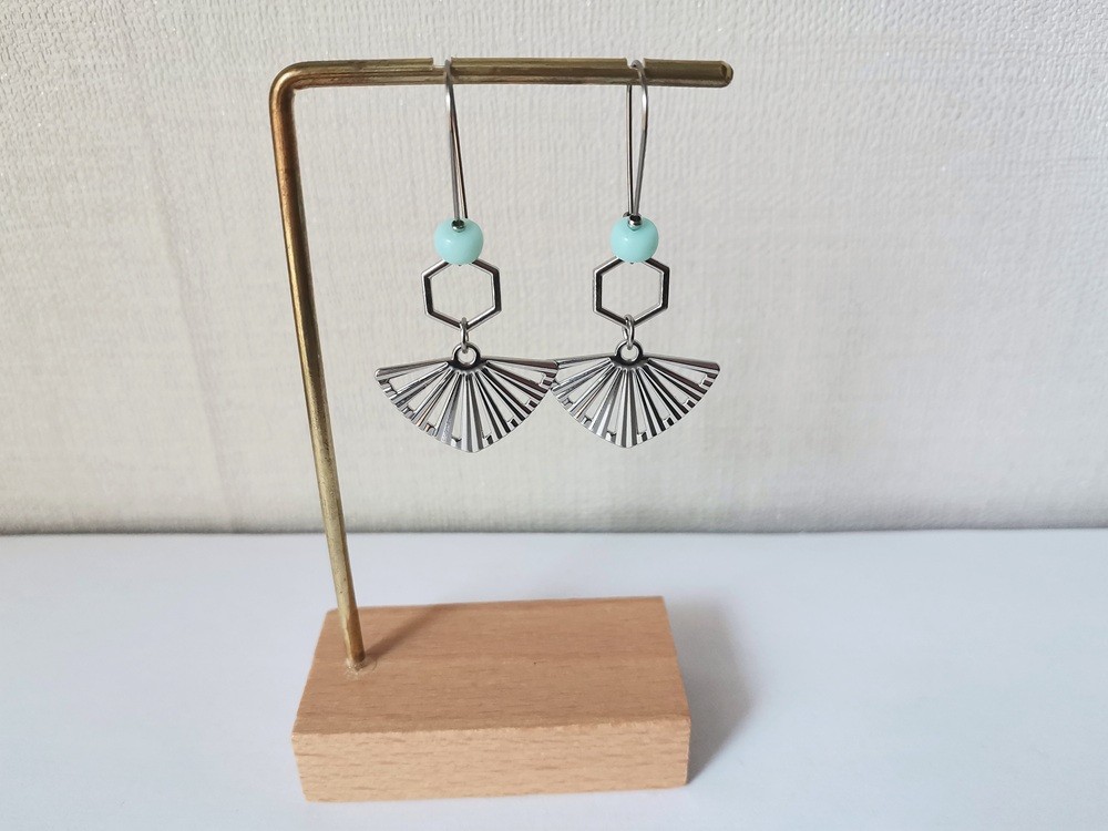 Boucles d'oreilles acier inoxydable pendentif éventail et perles bleu ciel