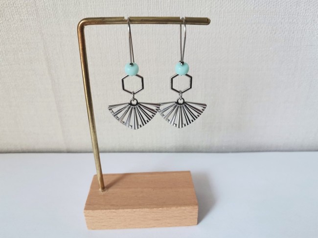 Boucles d'oreilles composées d'un pendentif forme éventail , connecteur octogonal et de perles en verre 6 mm rondelle