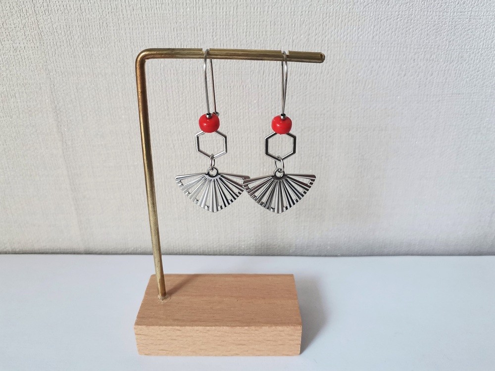 Boucles d'oreilles acier inoxydable pendentif éventail et perles rouge