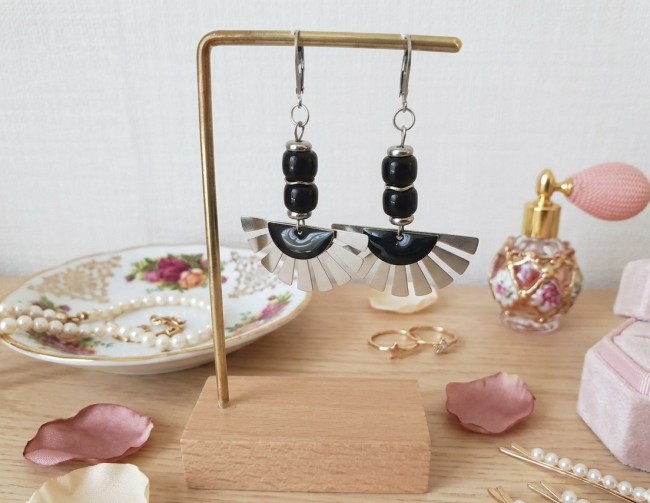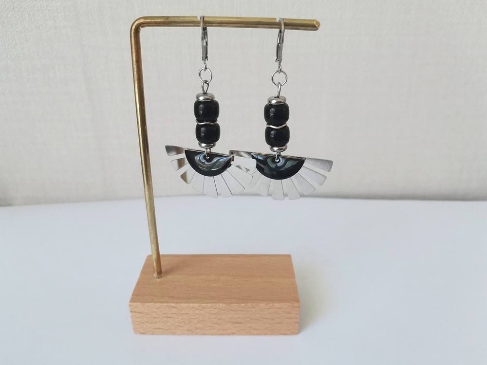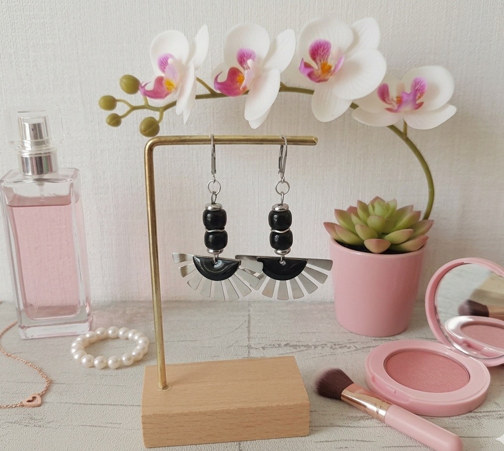 Boucles d'oreilles en acier inoxydable de couleur platine (pendentif éventail,dormeuse à levier, perles intercalaire, tige et anneaux en acier inoxydable) avec perles en verre colonne noires, pendentif éventail et sequin demi lune émail noir