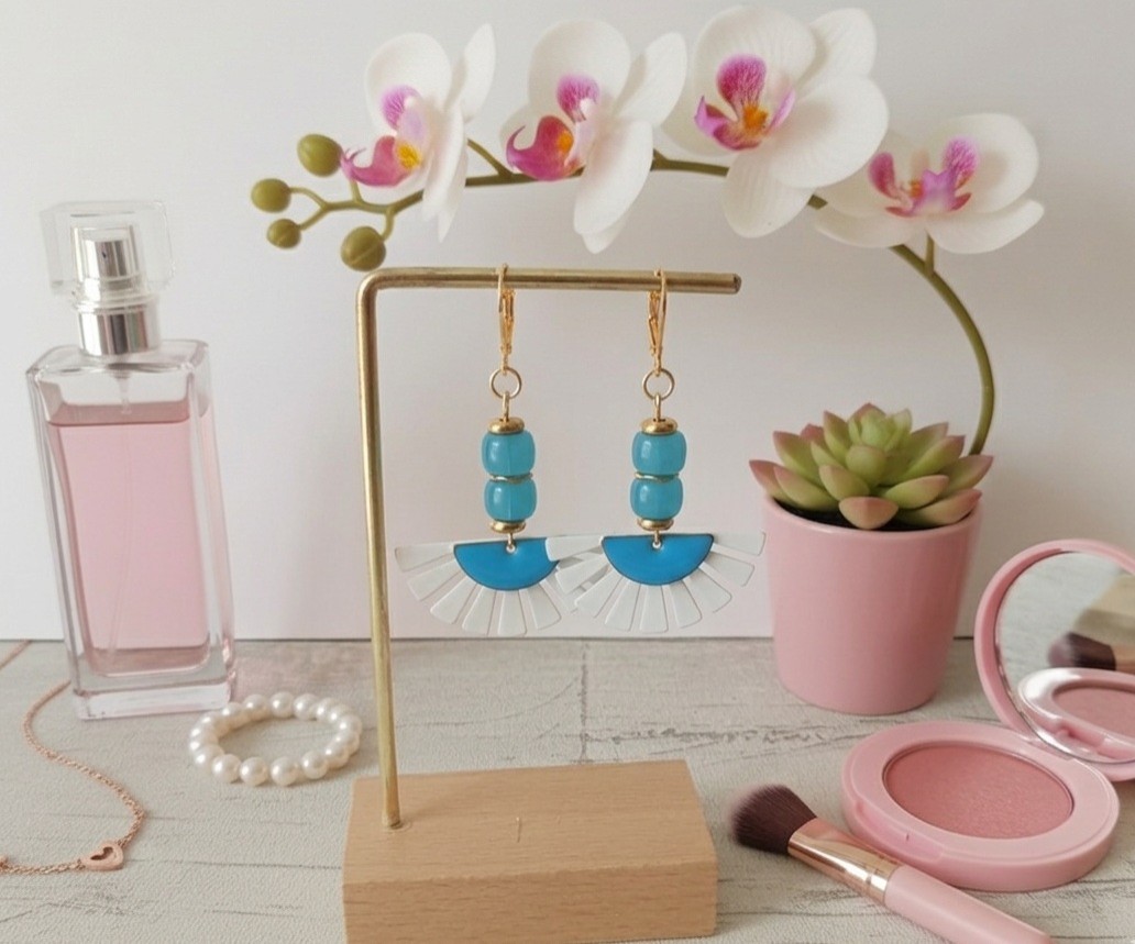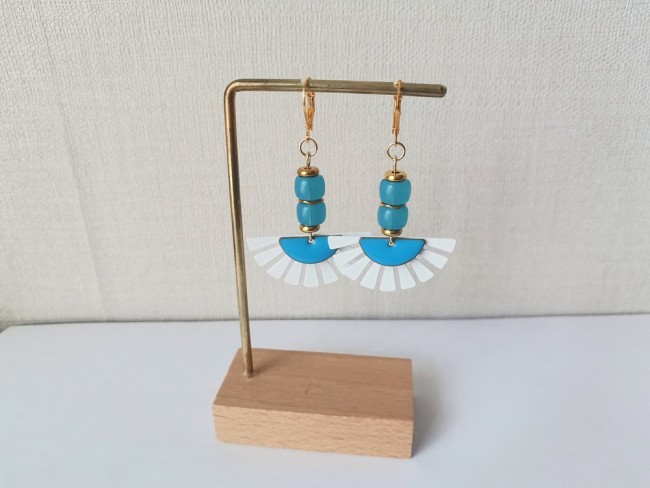 Boucles d'oreilles acier inoxydable (dormeuse, perles intercalaire rondelle, tige et anneaux) avec grand pendentif fer blanc, pendentif demi lune en émail et perles en verre colonne bleue