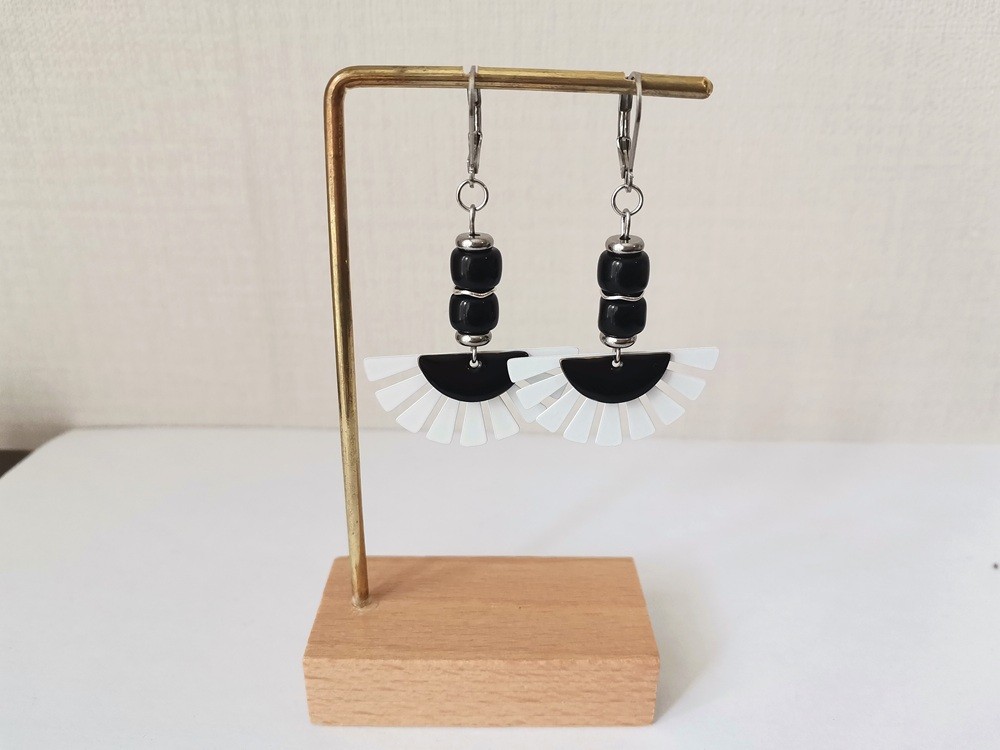 Boucles d'oreilles acier inoxydable (dormeuse, perles intercalaire rondelle, tige et anneaux) avec grand pendentif fer blanc, pendentif demi lune en émail et perles en verre colonne noires