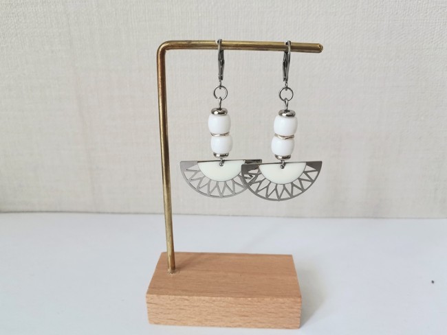 Boucles d'oreilles en acier inoxydable de couleur platine (pendentif éventail,dormeuse à levier, perles intercalaire, tige et anneaux en acier inoxydable) avec perles en verre colonne blanches, pendentif éventail et sequin demi lune émail blanc