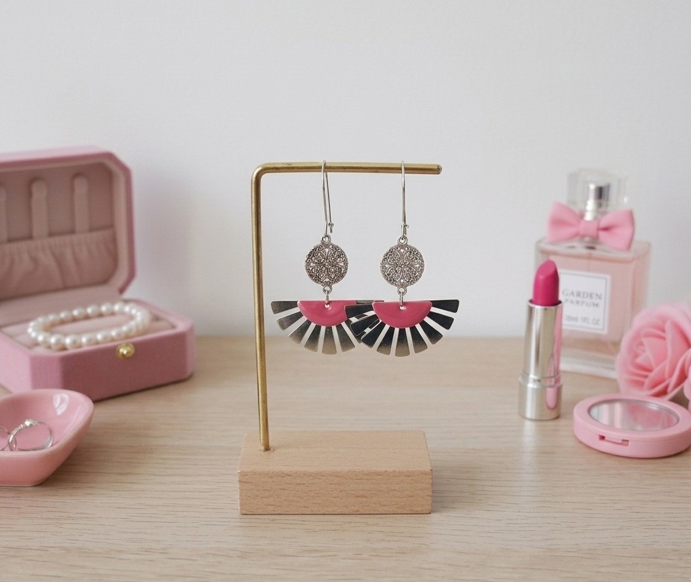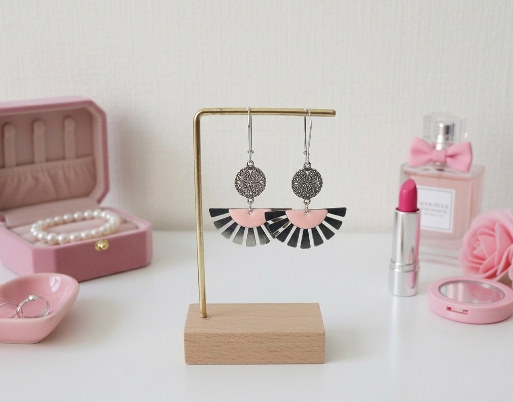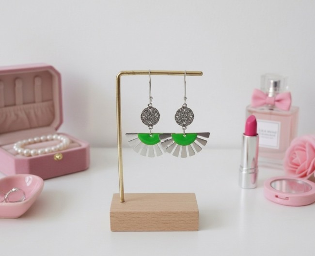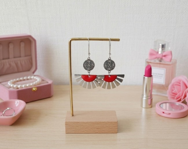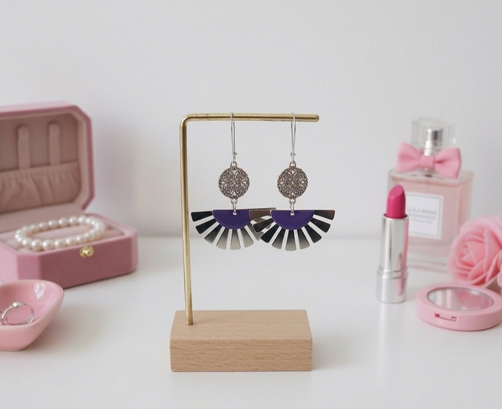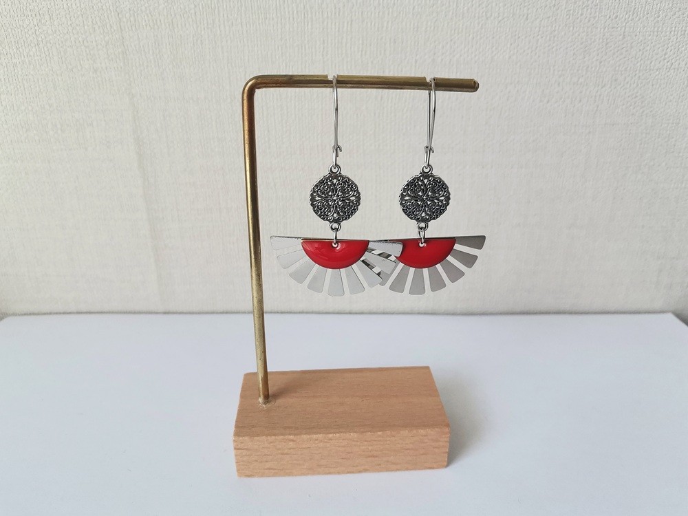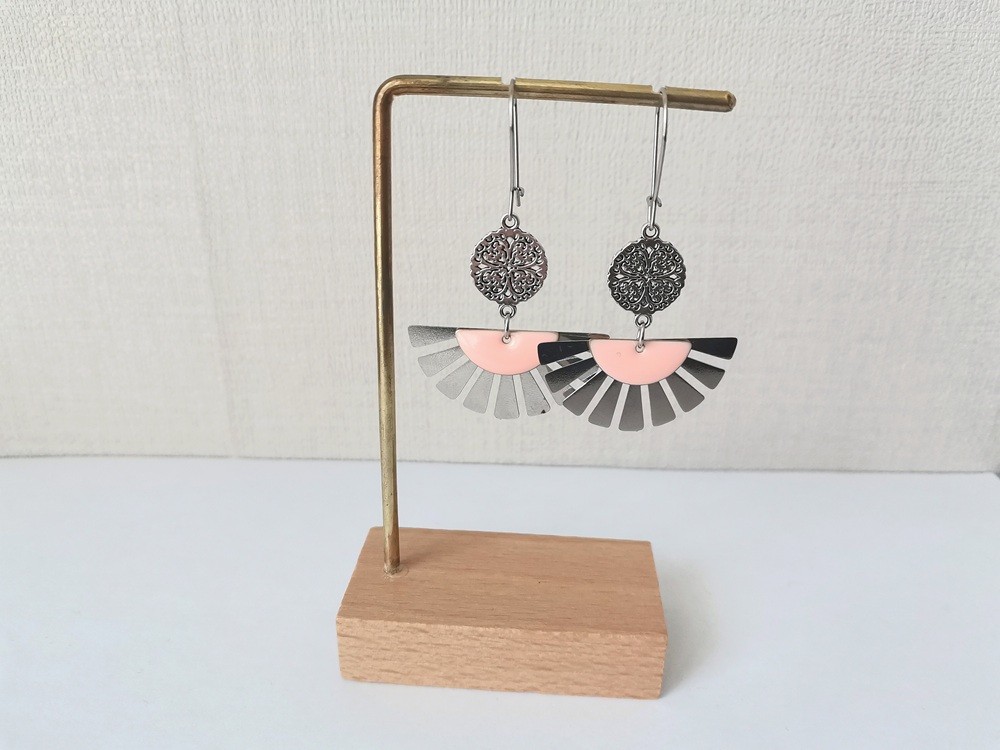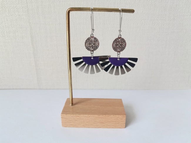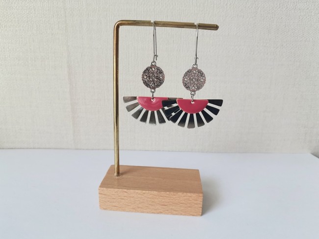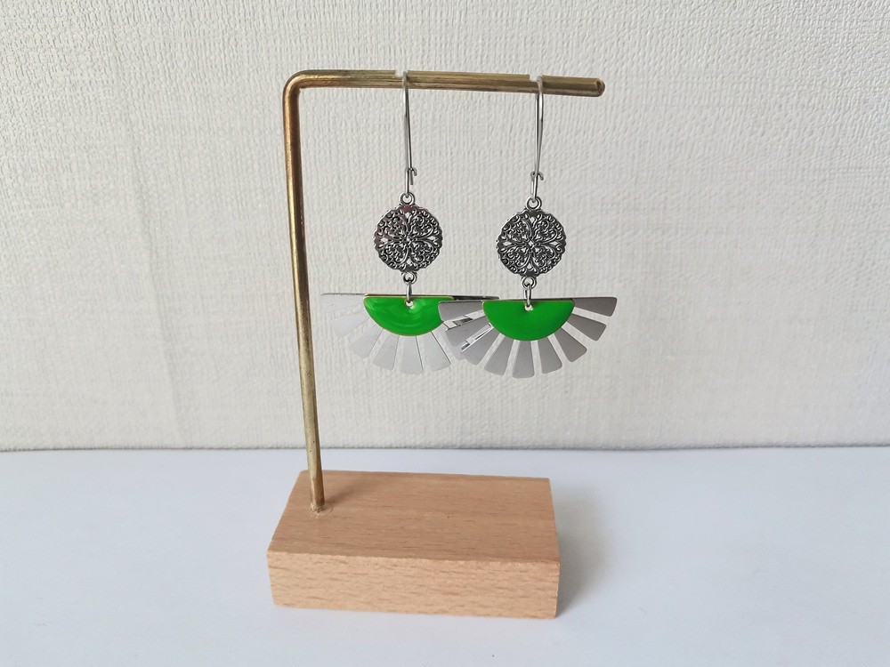Boucles d'oreilles composées d'un pendentif forme éventail , connecteur rond et sequi émail demi lune