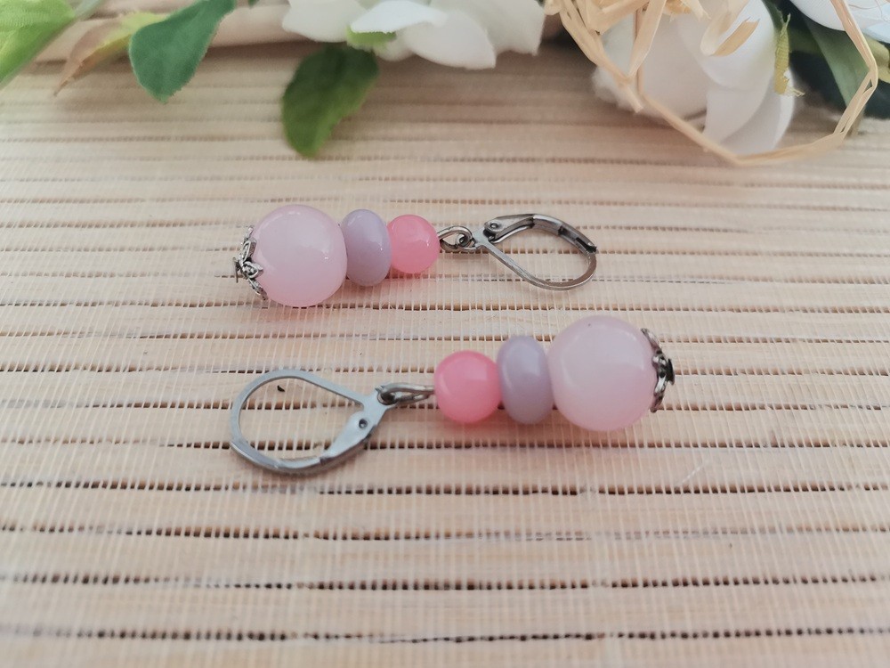 Boucles d'oreilles acier inoxydable et trio de perles en verre rose