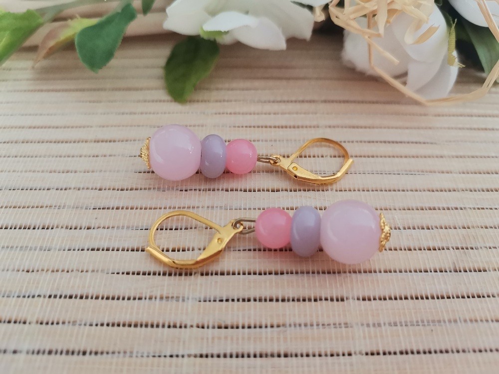 Boucles d'oreilles acier inoxydable doré et trio de perles en verre rose