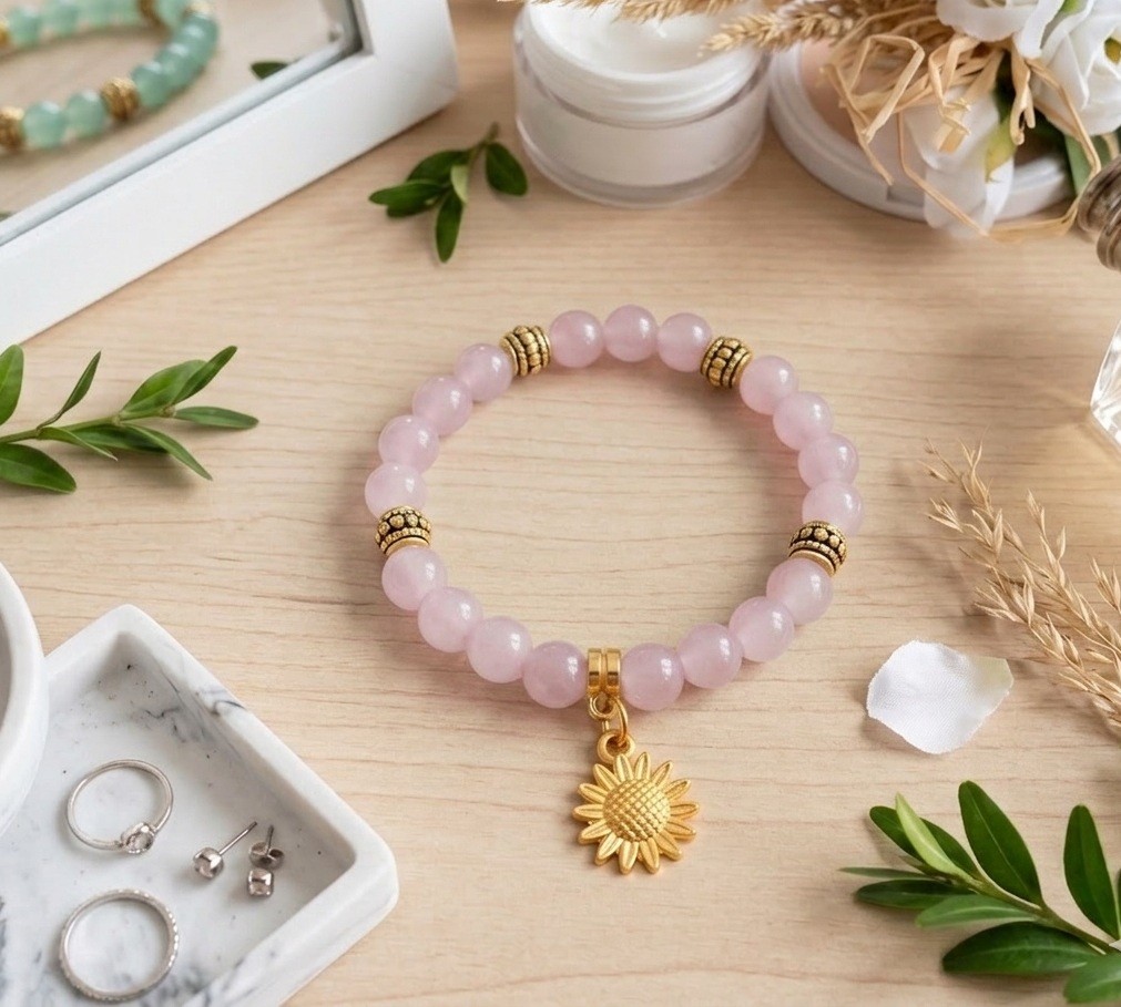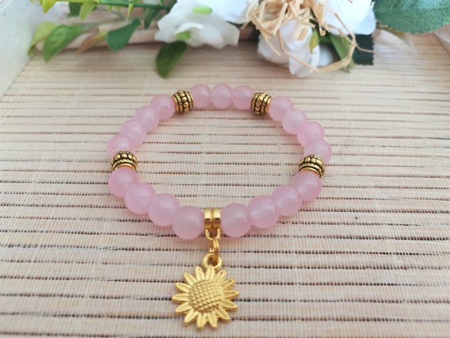 Bracelet sur fil élastique composé de perles en verre imitation jade 8 mm roses, perles métal dorées et bélière avec breloque fleur de tournesol dorée