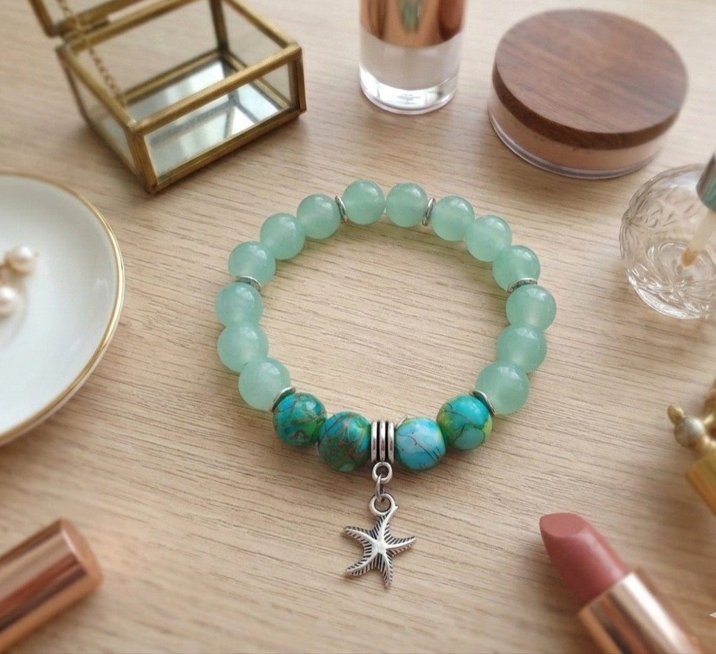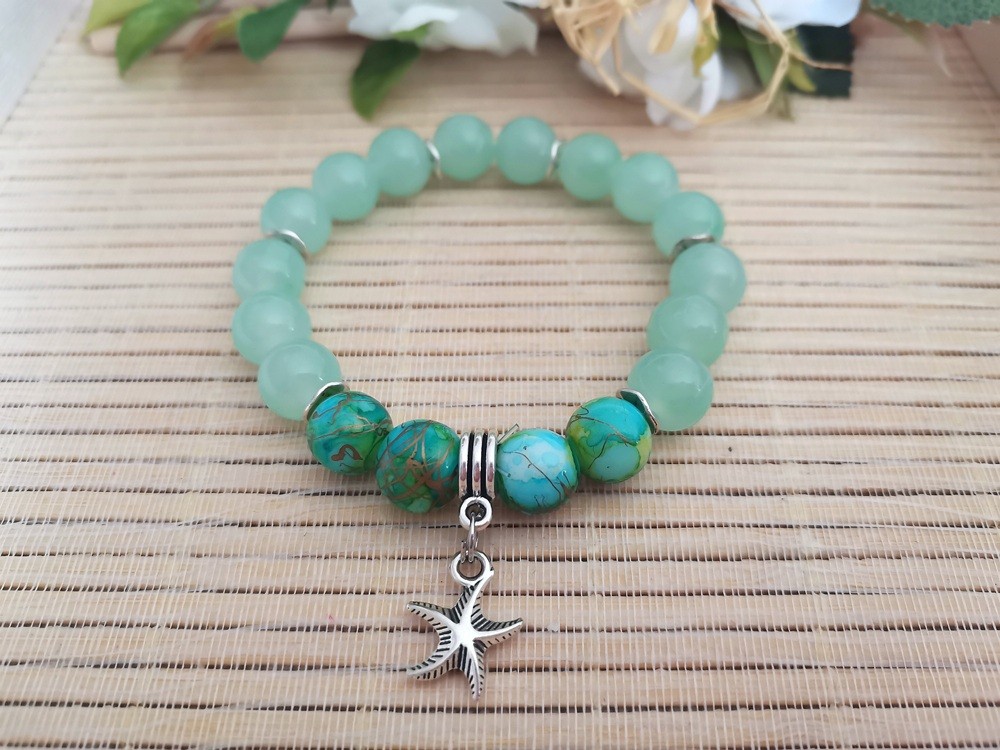 Bracelet sur fil élastique avec perles en verre imitation jade vert d'eau de 10 mm et perles en verre tréfilé avec perles ondulées intercalaires et breloque étoile de mer