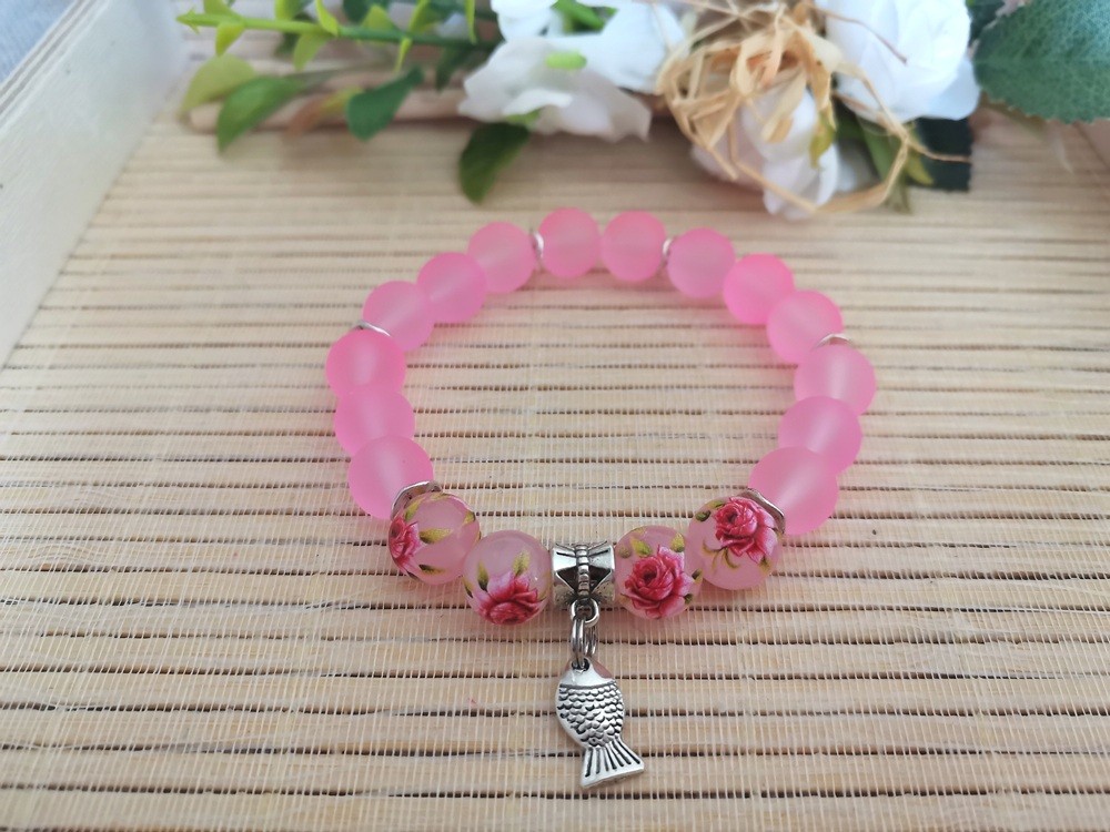Bracelet sur fil élastique avec perles en verre givré rose de 10 mm et perles en verre motif rose rouge avec perles ondulées intercalaires et breloque poisson