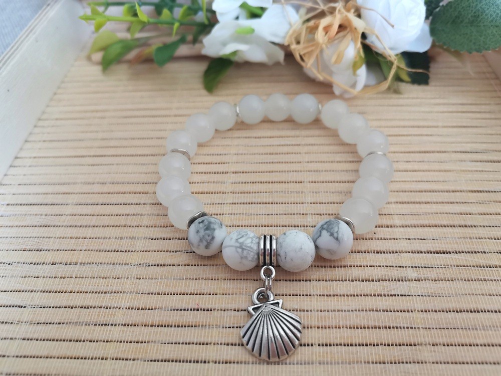 Bracelet sur fil élastique avec perles en verre imitation jade blanche transparente de 10 mm et perles en verre blanche tréfilé noire avec perles ondulées intercalaires et breloque coquillage