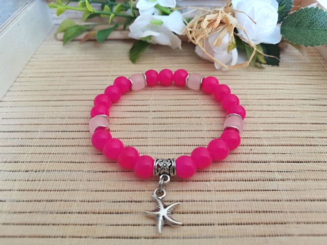 Bracelet sur fil élastique composé de perles en verre imitation jade 8 mm fuchsia, perles métal ondulé argent mat 7 mm et bélière avec breloque étoile de mer