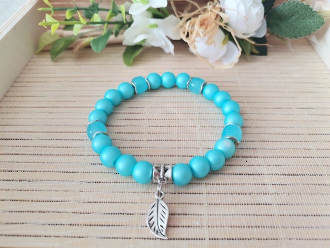 Bracelet sur fil élastique composé de perles en verre bleu ciel 8 mm , perles en verre colonne 8 bleu transparent, perles métal ondulé argent mat 7 mm et bélière avec breloque feuille