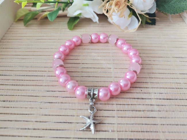 Bracelet sur fil élastique composé de perles en verre nacré rose 8 mm , perles en verre colonne 8 rose transparent, perles métal ondulé argent mat 7 mm et bélière avec breloque étoile de mer