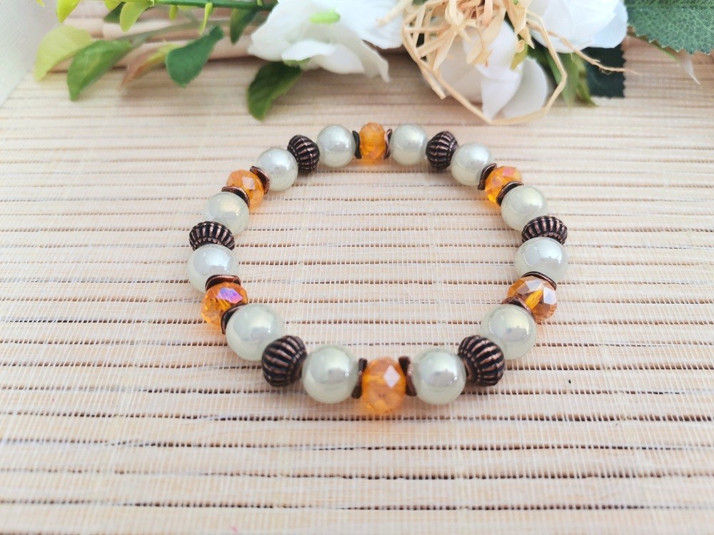 Bracelet sur fil élastique avec perles en verre 8 mm , perles à facettes 8 x 6 mm et apprêts de couleur cuivre orouge