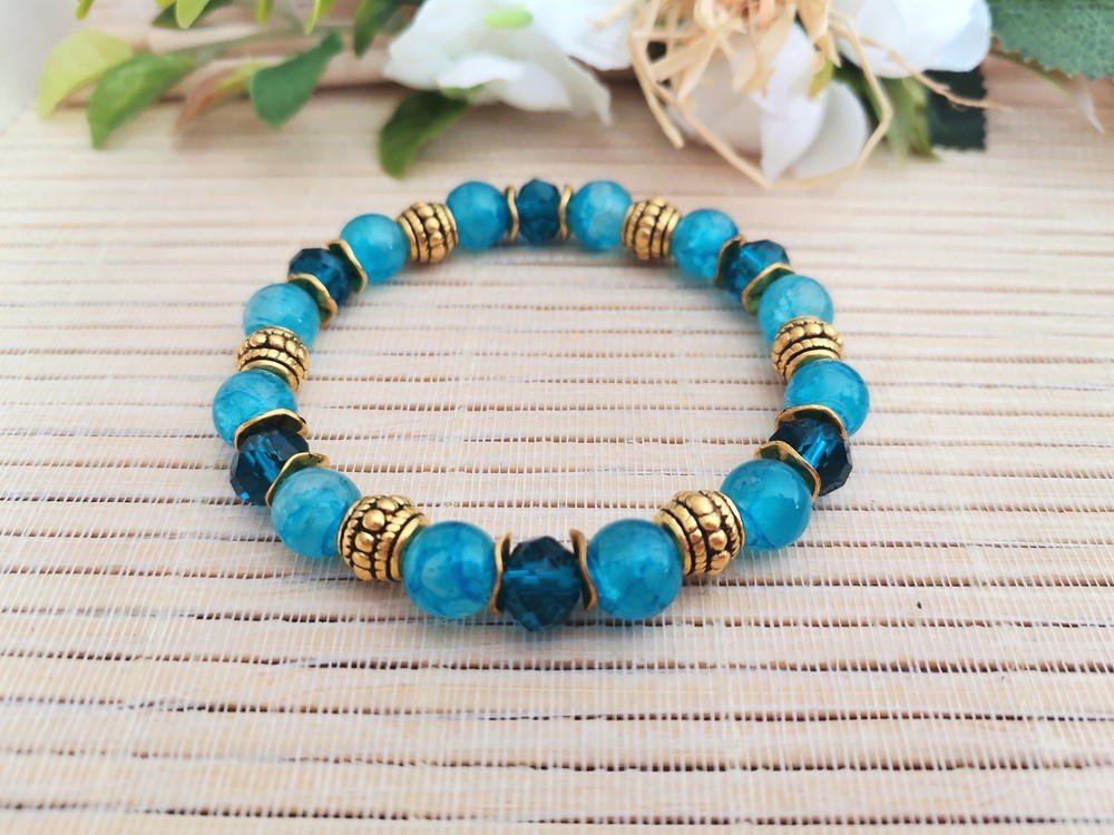 Bracelet sur fil élastique avec perles en verre 8 mm bleu , perles à facettes 8 x 6 mm et apprêts de couleur doré