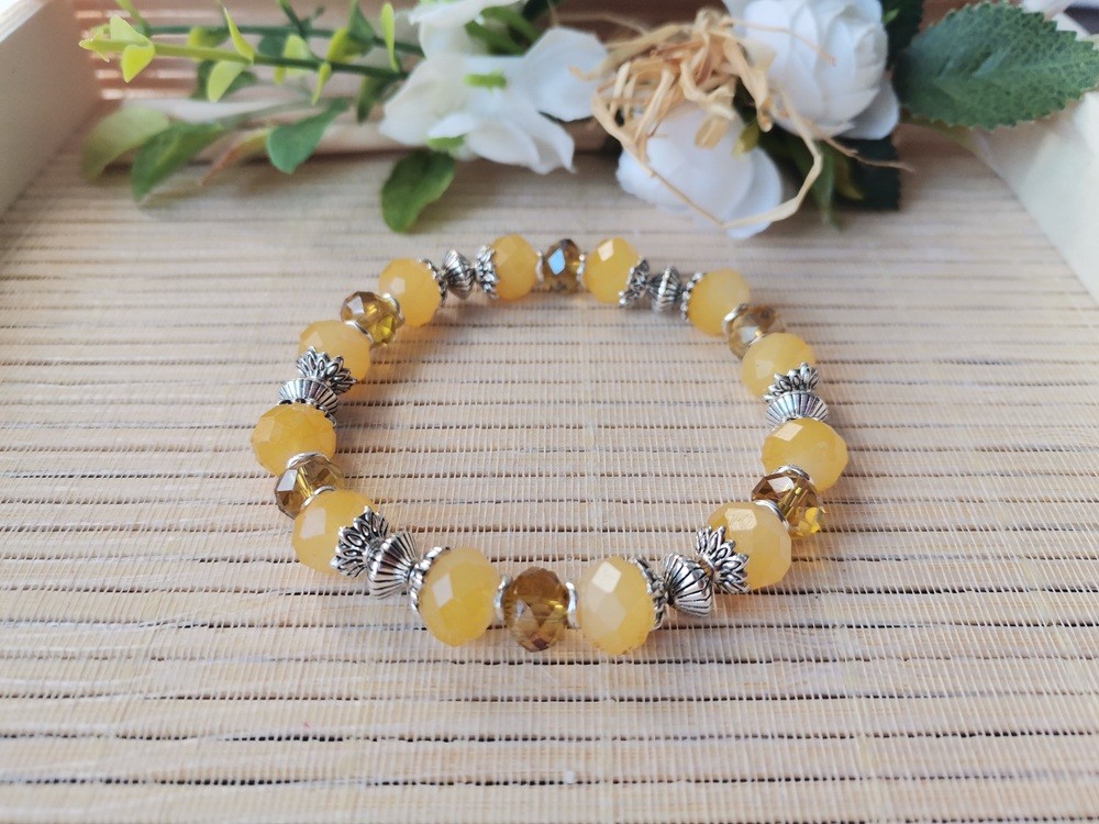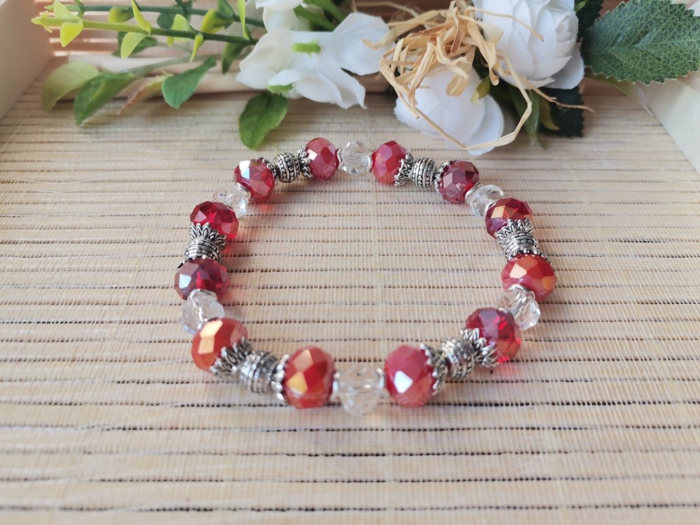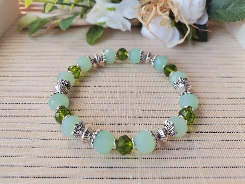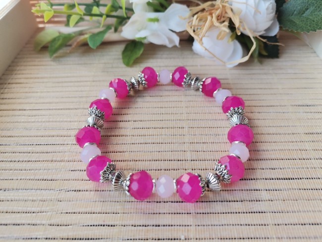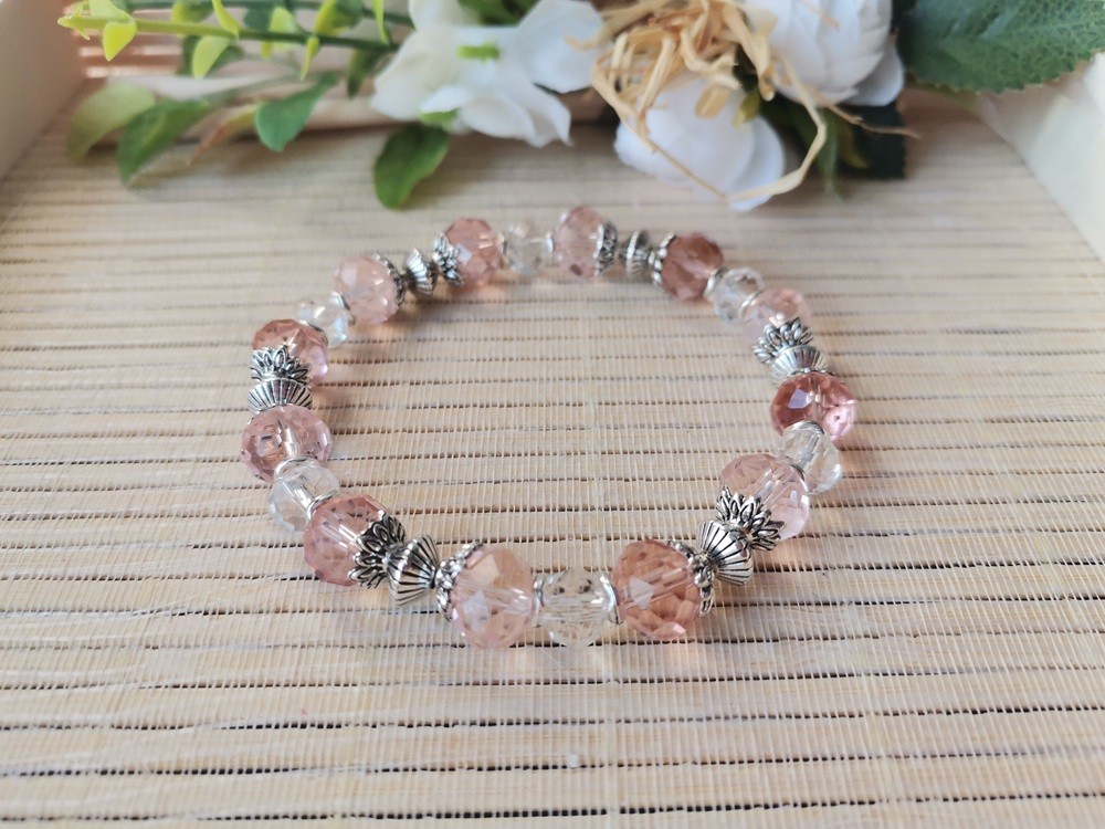 Bracelet sur fil élastique avec perles en verre à facette de 10 mm , perles à facettes 8 mm et apprêts de couleur argent mat