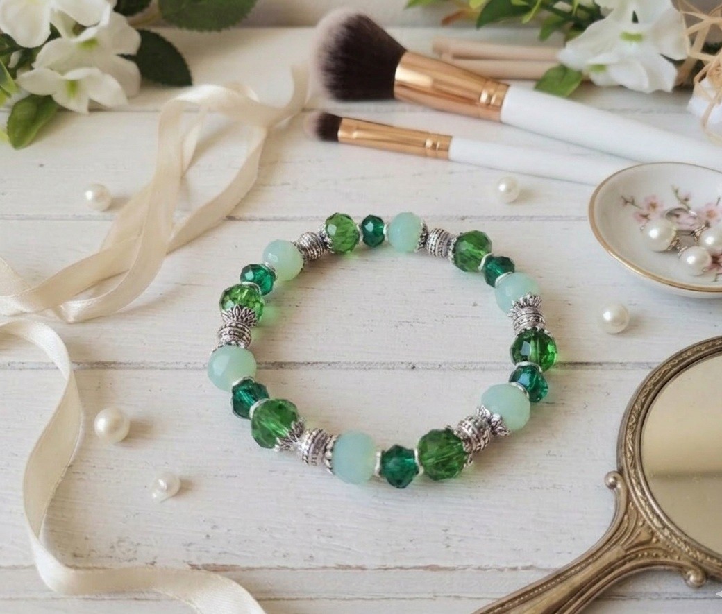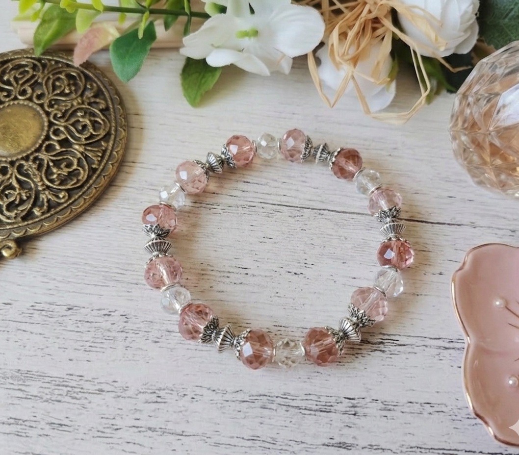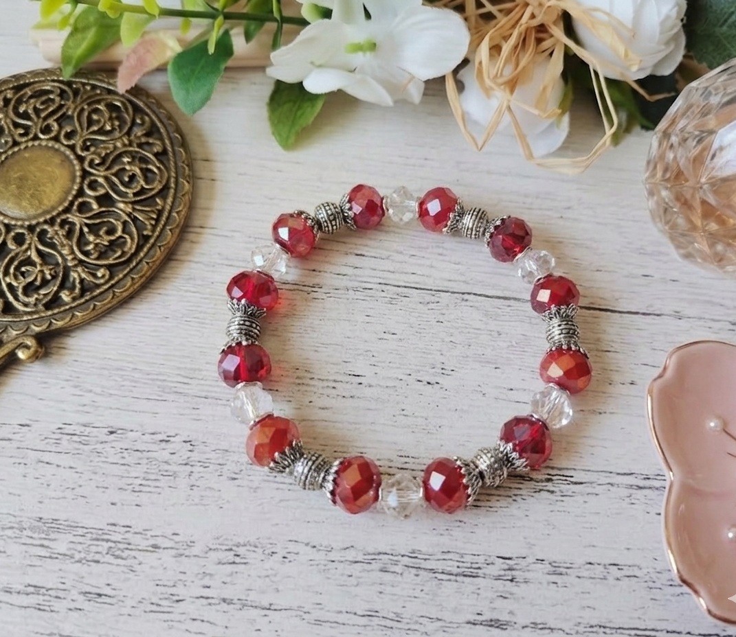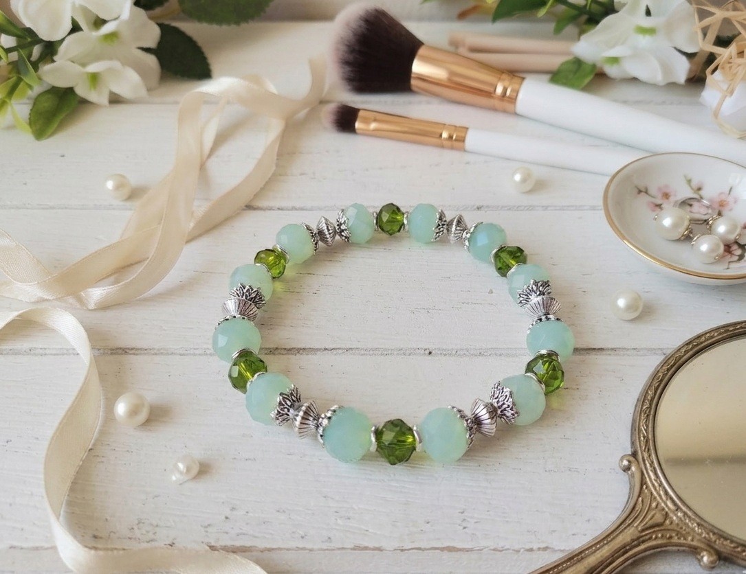 Bracelet sur fil élastique avec perles en verre à facette de 10 mm , perles à facettes 8 mm et apprêts de couleur argent mat