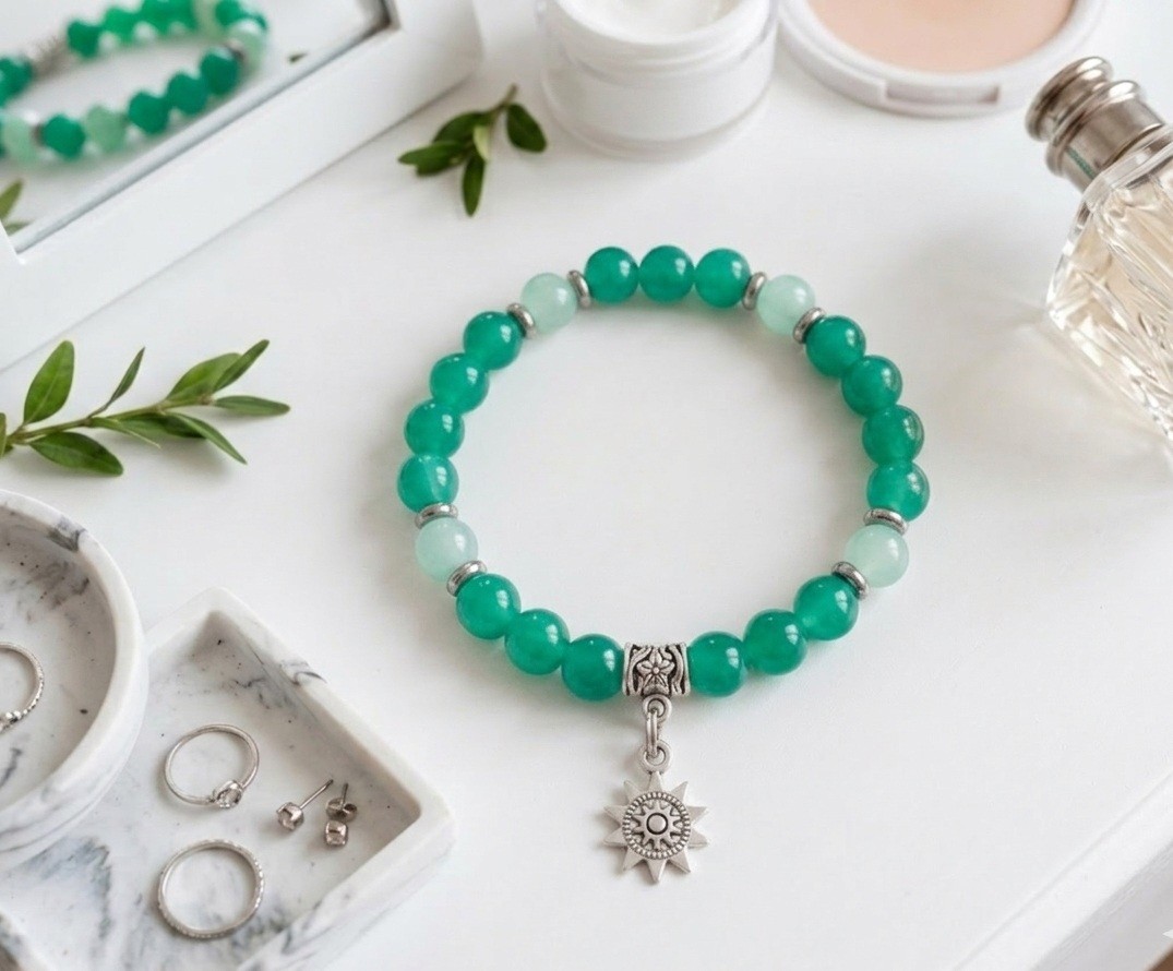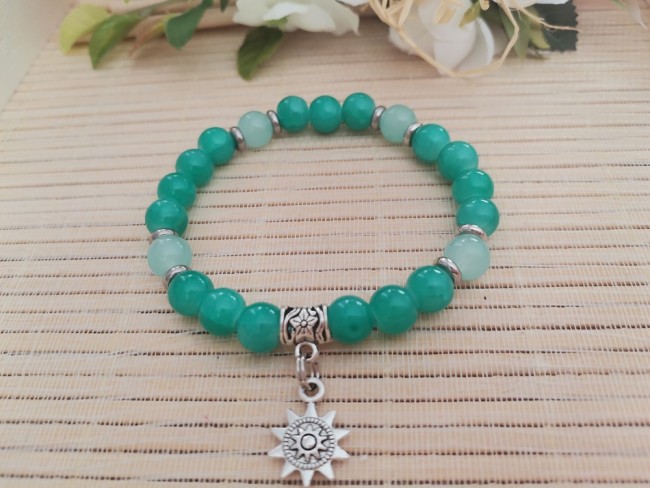 Bracelet sur fil élastique composé de perles en verre imitation jade vert émeraude 8 mm , perles en verre imitation jade 8 vert clair, perles rondelle acier inoxydable 6 mm et bélière avec breloque étoile