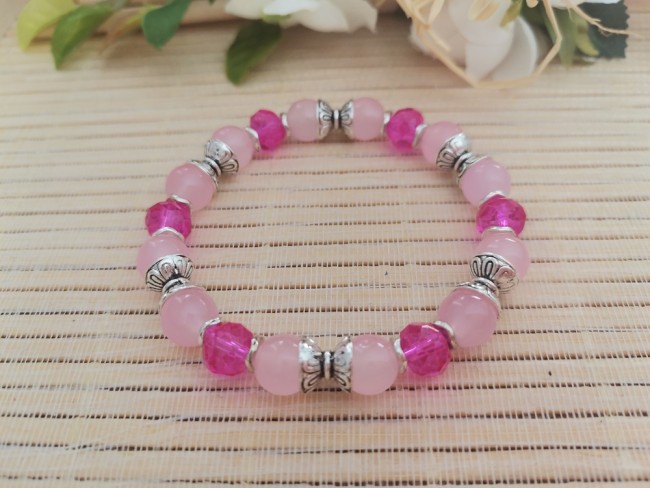 Bracelet sur fil élastique composé de perles en verre imitation jade rose 8 mm , perles en verre à facette 8 fuchsia et apprêts de couleur argent mat