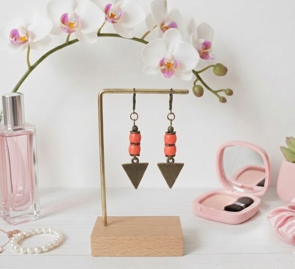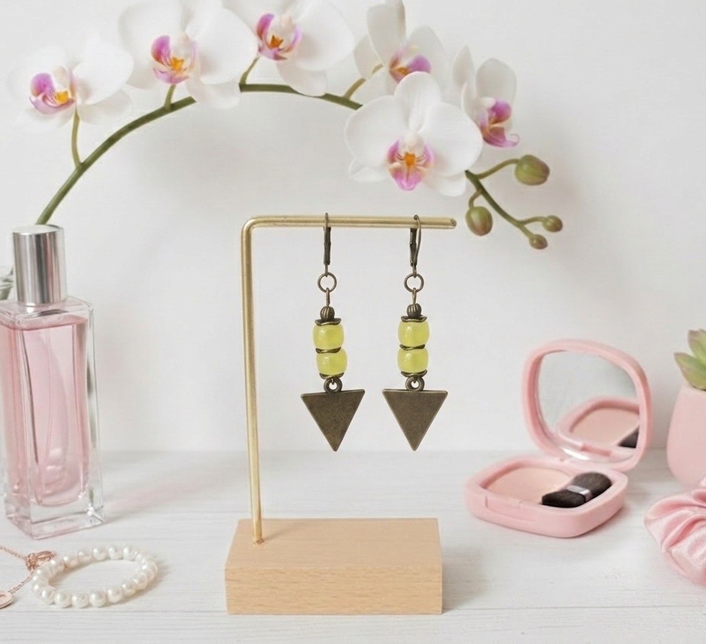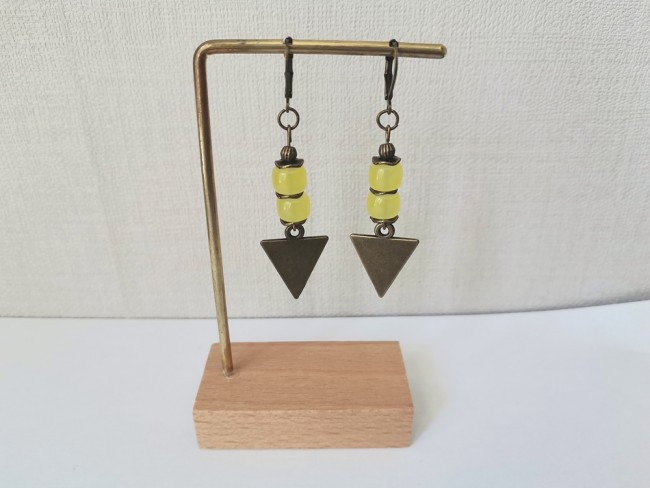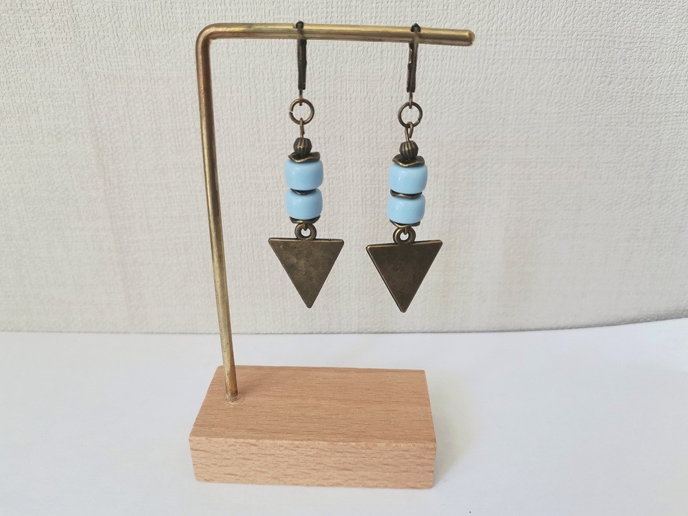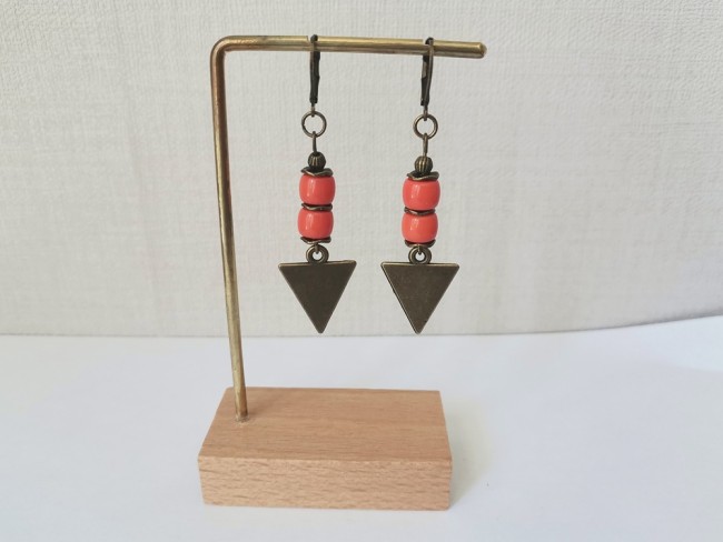 Boucles d'oreilles pendantes avec pendentif triangle en métal, perles en verre colonne et apprêts de couleur bronze