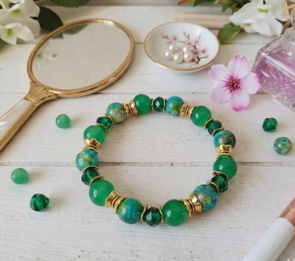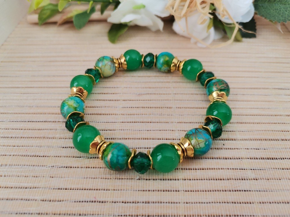 Bracelet sur fil élastique avec perles en verre imitation jade de couleur vert émeraude et perles en verre tréfilé de 10 mm , perles en verre à facettes de 8 x 6 mm avec apprêts de couleur dorée