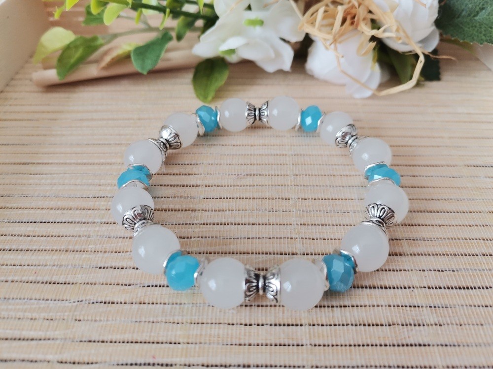 Bracelet sur fil élastique avec perles en verre imitation jade de couleur blanche de 10 mm , perles en verre à facettes de 8 x 6 mm avec apprêts de couleur argent mat