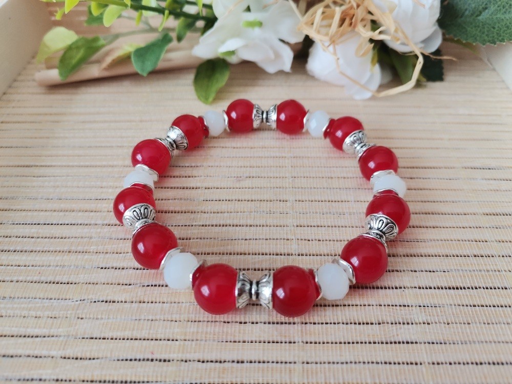 Bracelet sur fil élastique avec perles en verre imitation jade de couleur rouge de 10 mm , perles en verre à facettes de 8 x 6 mm avec apprêts de couleur argent mat