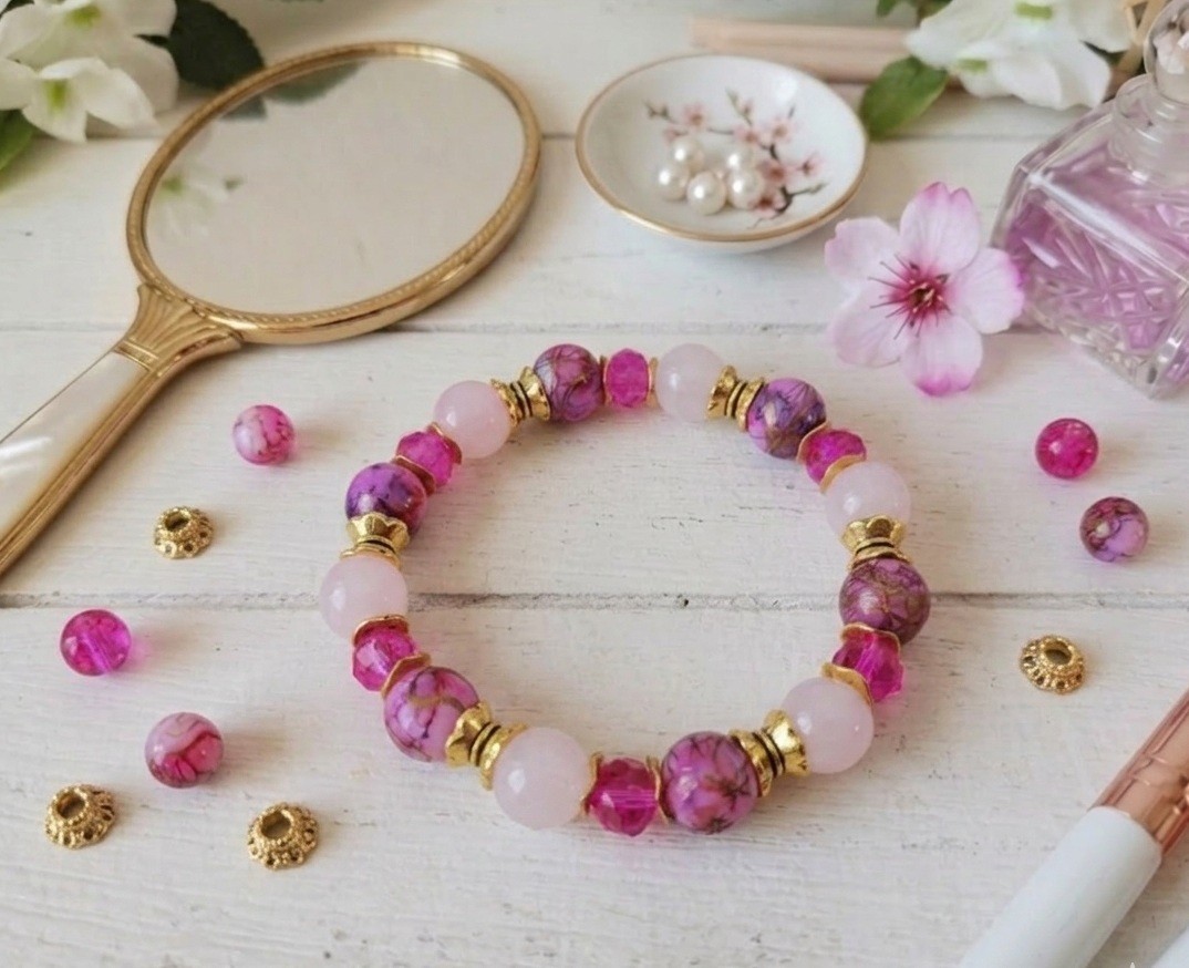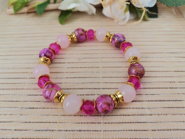 Bracelet sur fil élastique avec perles en verre imitation jade de couleur rose de 10 mm, perles en verre tréfilé, perles en verre à facettes de 8 x 6 mm avec apprêts de couleur doré