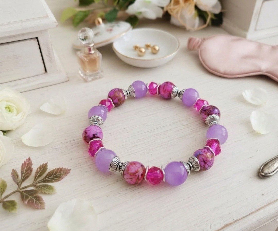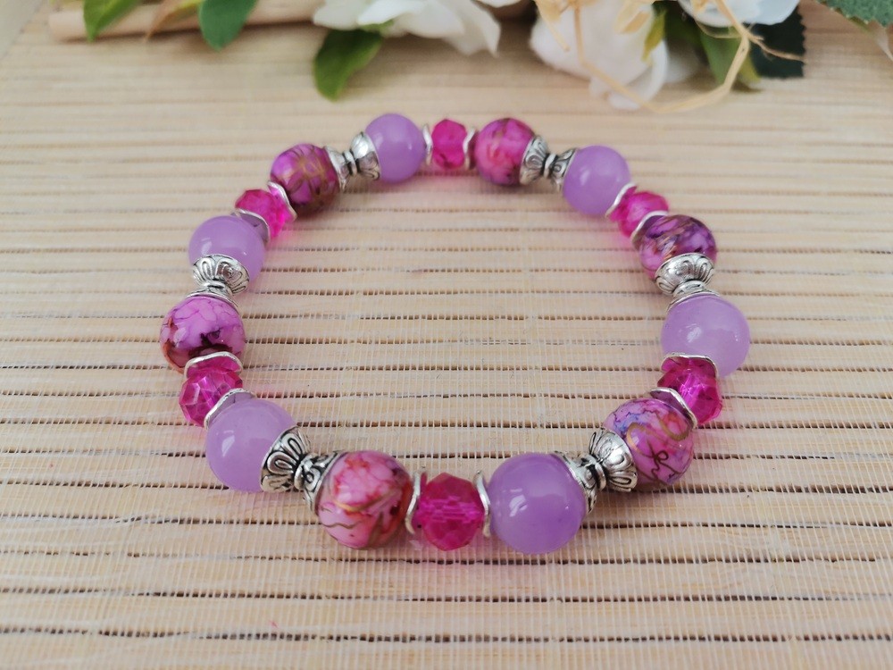 Bracelet sur fil élastique avec perles en verre imitation jade de couleur lilas de 10 mm, perles en verre tréfilé, perles en verre à facettes de 8 x 6 mm avec apprêts de couleur argent mat