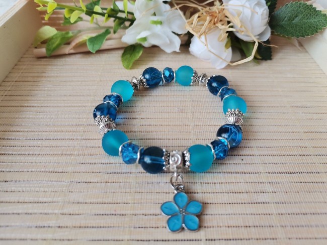Bracelet sur fil élastique avec perles en verre givré et tréfilé de couleur bleu de 10 mm, perles en verre à facettes de 8 x 6 mm avec apprêts de couleur argent mat et breloque fleur bleu émail