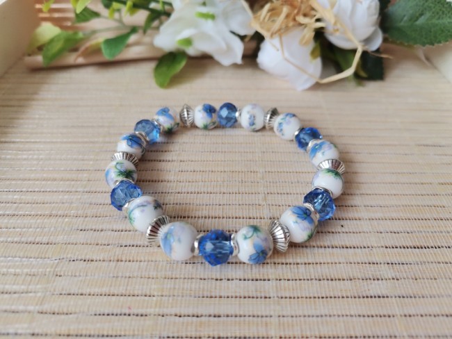 Bracelet sur fil élastique composé de perles en porcelaine de 8 mm blanche motifs fleurs bleues , perles en verre à facette de 8 x 6 mm bleu azur et apprêts de couleur argent mat