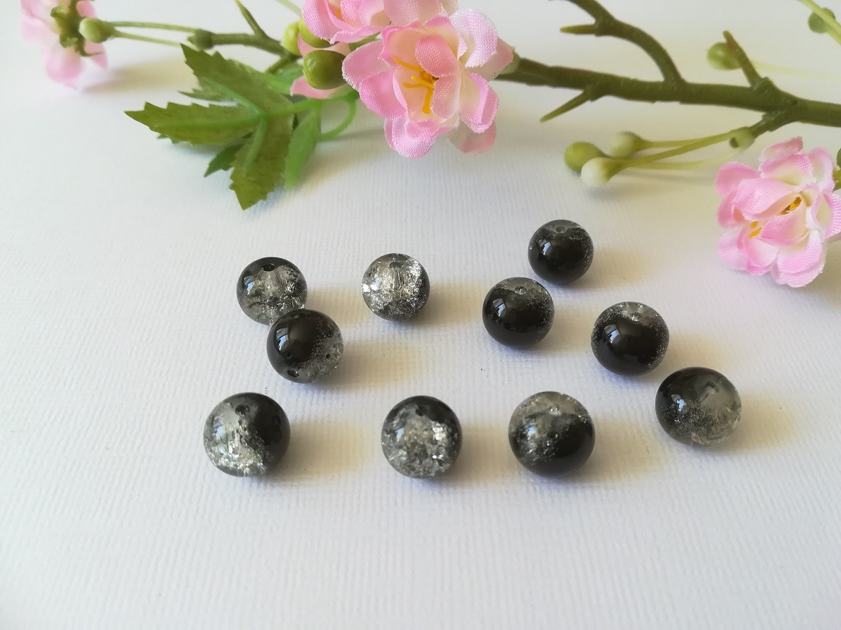 10 Perles en verre craquelé 10 mm noir et cristal